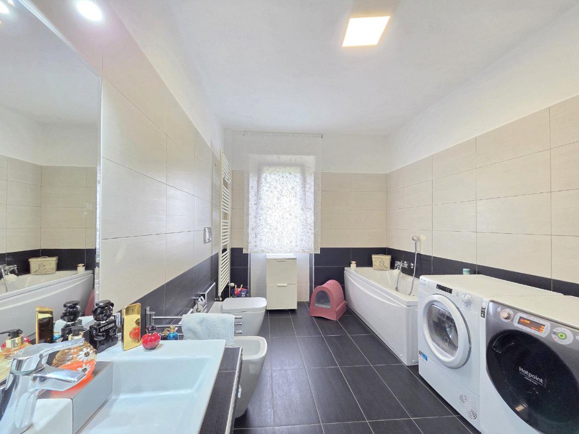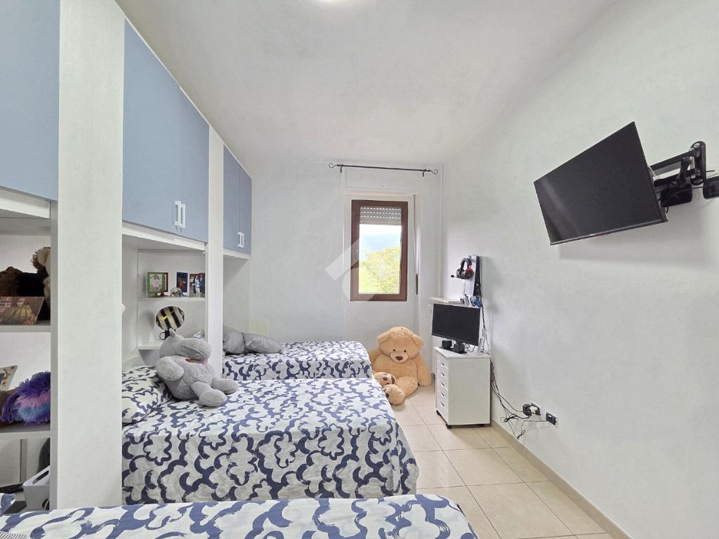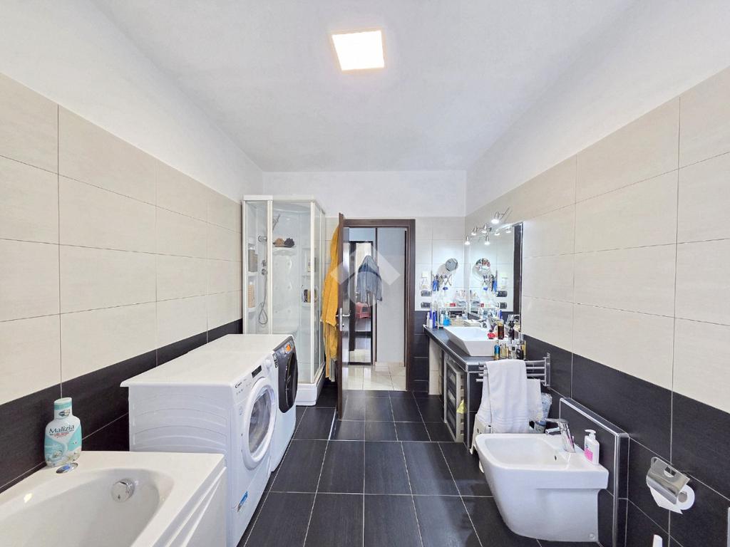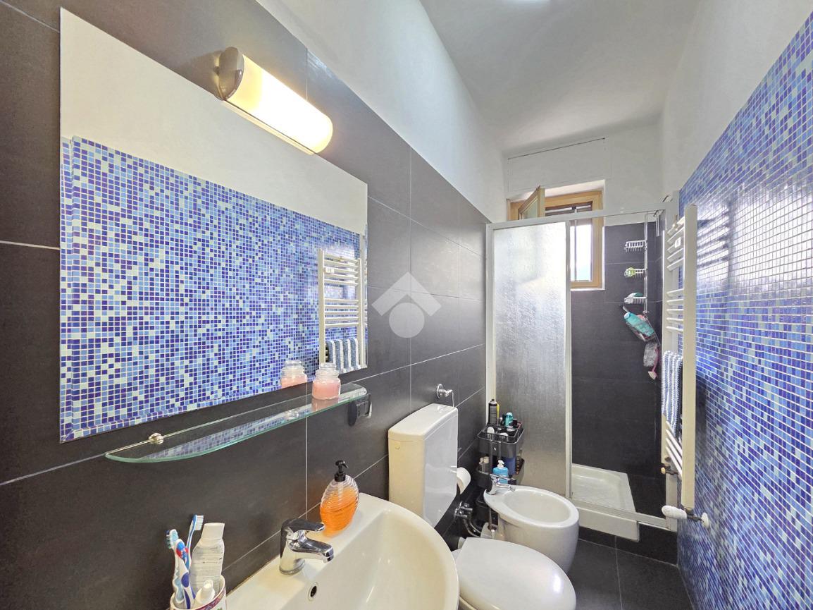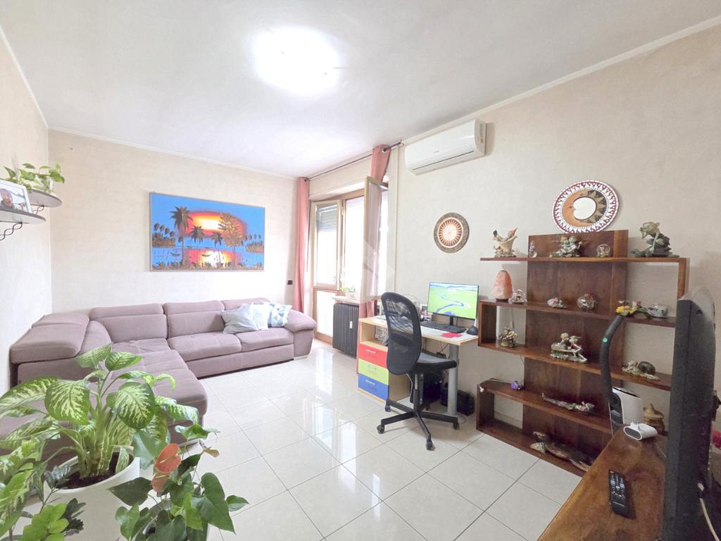 La zona giorno living, accessibile dalla porta blindata, si presenta ampia e luminosa. Caratterizzata dalle lunghe e lineari pareti facilmente arredabili, ospita l'impianto di climatizzazione che funge anche da pompa di calore. Adiacente a quest'ultima, separata da un tramezzo facilmente abbattibile che consentirebbe l'unione dei due locali, è presente il soggiorno. Anch'esso arricchito dall'impianto di climatizzazione, consente di raggiungere il balcone che collega anche il living. Valorizzato dalle tende da sole ed invernali, entrambe a rullo, il balcone affaccia sul lato principale del condominio. Attraverso il disimpegno con funzionalità di antibagno, è possibile raggiungere la zona notte composta da 2 camere matrimoniali, bagno e sala da bagno. La prima camera da letto, adiacente al bagno più piccolo, ospita l'impianto di climatizzazione e si presenta ampia e molto lunga nelle sue pareti. Il primo bagno finestrato ospita la doccia ed è rifinito in simil mosaico. Adiacente ad esso è presente la sala da bagno finestrata. Caratterizzata dalle sue dimensioni, quest'ultima ospita i sanitari a filo muro e, al suo interno trovano spazio la vasca idromassaggio e la doccia angolare idro. Lavatrice ed asciugatrice sono adiacenti tra loro e, il lavandino è in muratura. La seconda camera da letto, anch'essa matrimoniale, è posizionata verso la parte interna del fabbricato ed ancora provvista dell'impianto di climatizzazione. A completare la proprietà del piano è il comodo e funzionale ripostiglio. Posizionato al secondo ed ultimo piano di un fabbricato edificato negli anni '70, l'appartamento gode di una doppia esposizione che lo rende particolarmente luminoso. La cantina è ubicata al piano interrato e, il garage di proprietà è all'interno del cortile accessibile dal carraio meccanizzato. Sicuramente interessante per il suo utilizzo, è il giardino in uso esclusivo posizionato nella parte più riservata del condominio. Grazie alla completa ristrutturazione, l'appartamento si presenta abitabile da subito senza intervento alcuno, compresi gli infissi esterni.