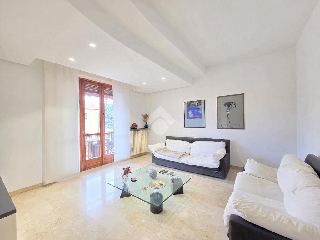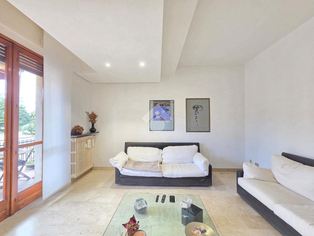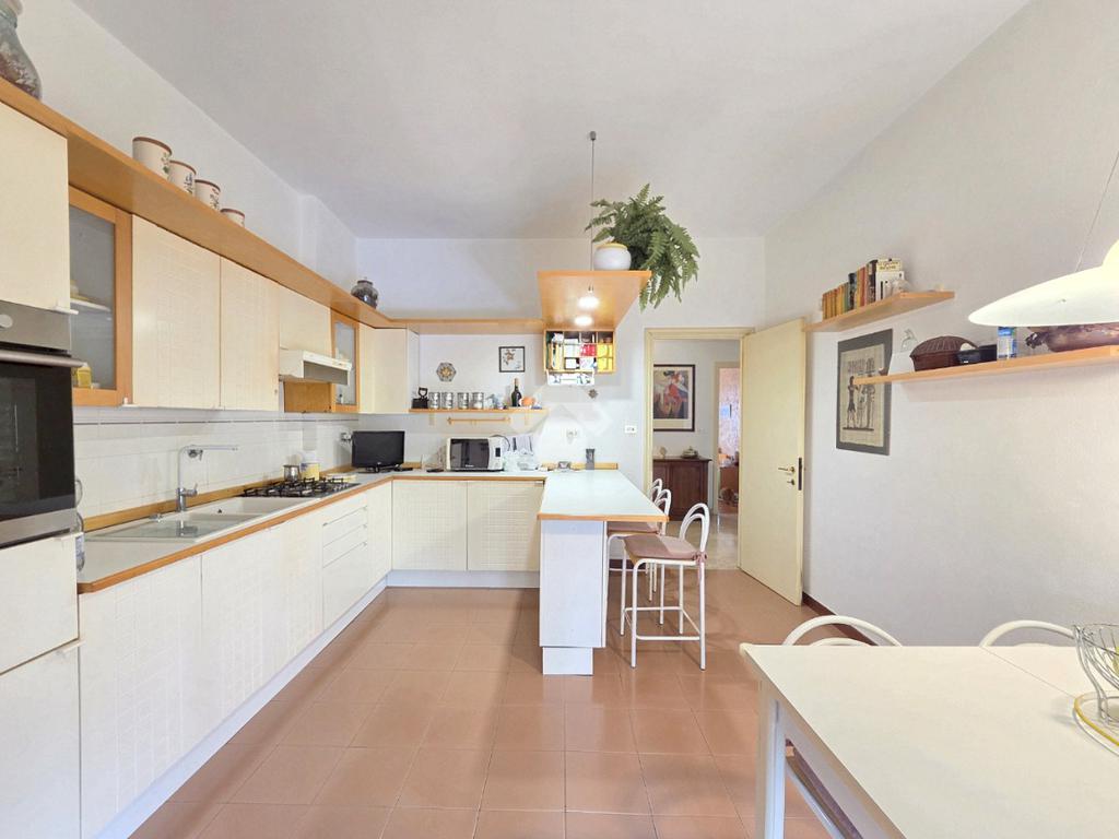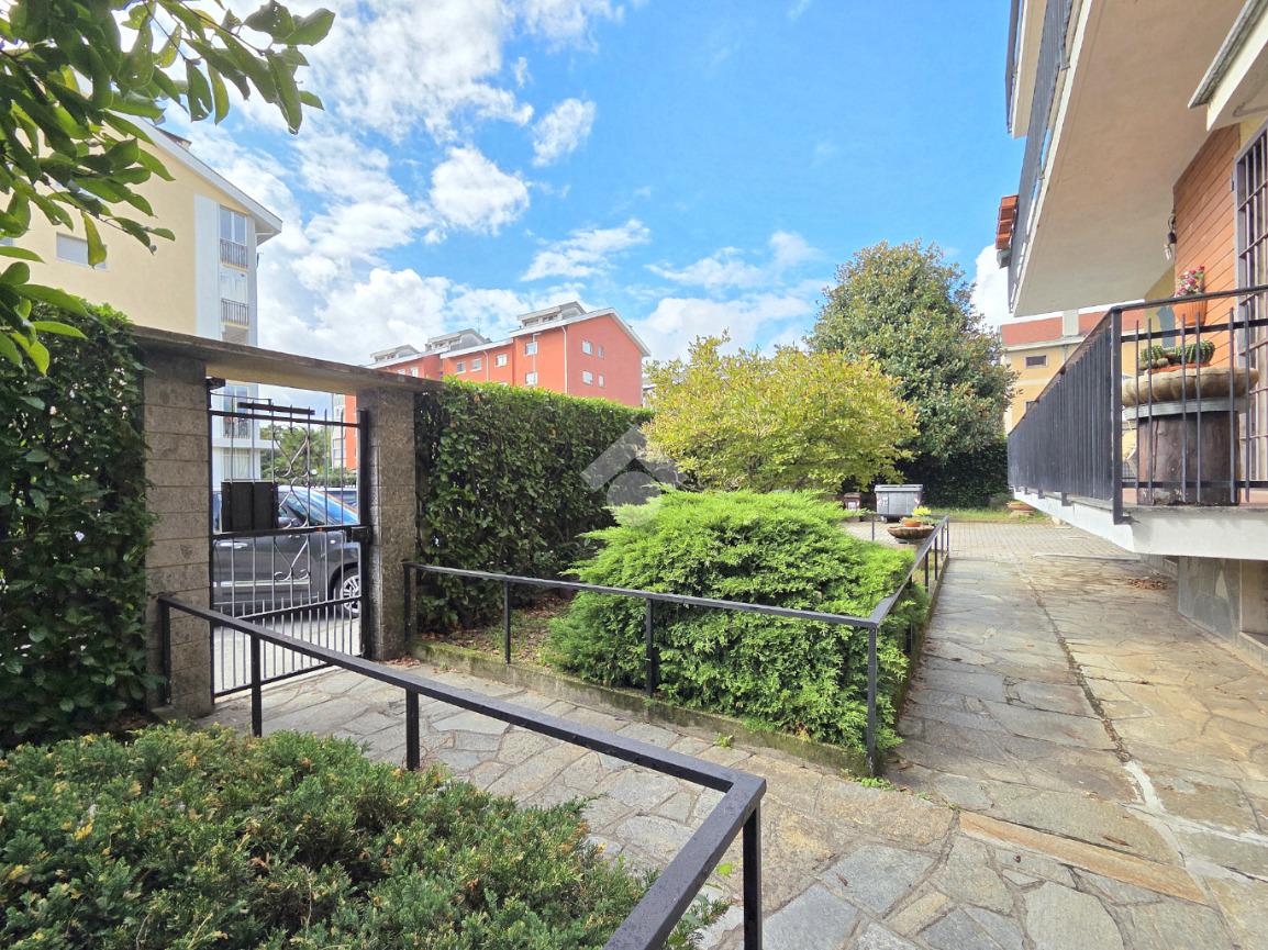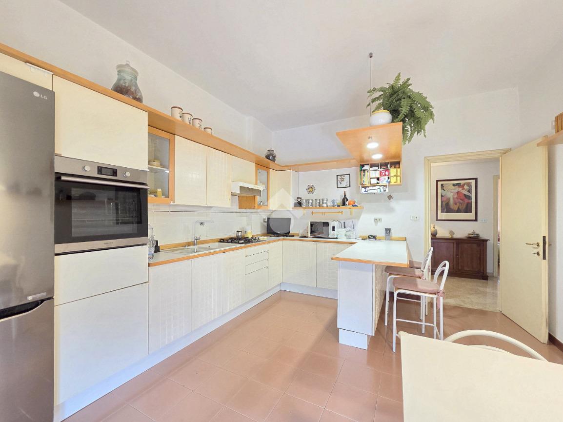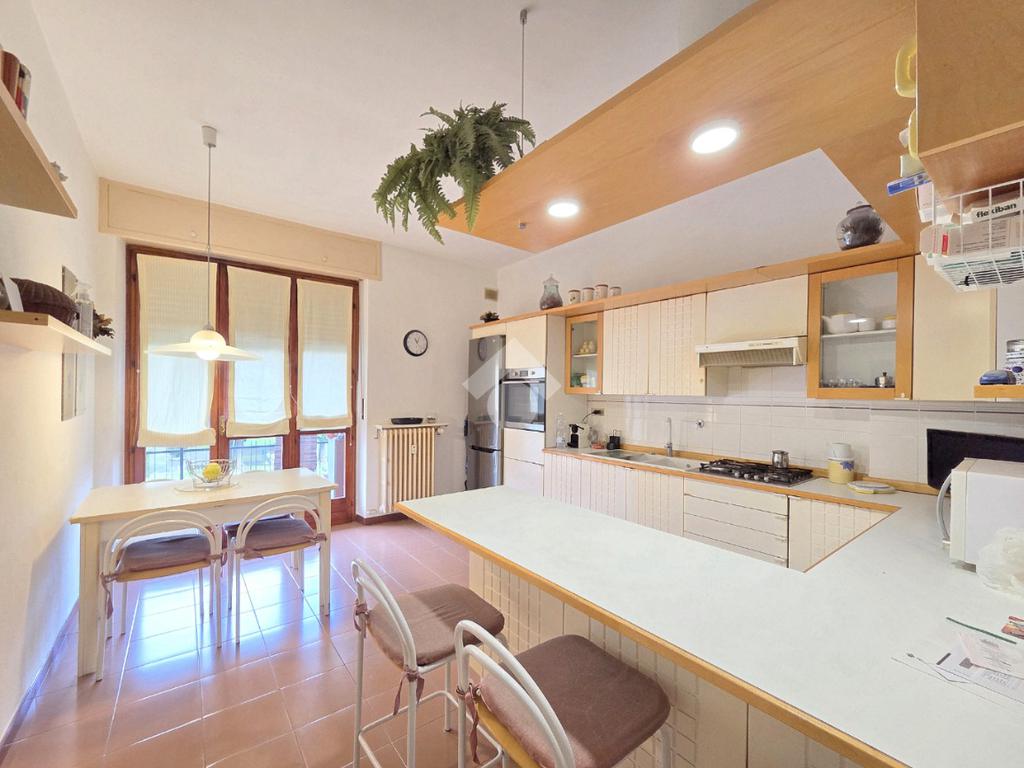 Inserito in un piccolo contesto abitativo edificato negli anni '70, privo di amministratore e di spese condominiali, l'appartamento è posizionato al primo piano di due e possiede una tripla esposizione. Caratterizzato dalla splendida controsoffittatura curva che ospita l'illuminazione a faretti, il soggiorno si presenta ampio e luminoso. La sua pavimentazione in marmo bianco percorre anche il grande disimpegno, donando una piacevole omogeneità. L'accesso al primo terrazzino, arricchito dalle tende da sole a rullo, è possibile dal salone e dalla cucina. Percorrendo il balcone angolare e, raggiunta la cucina, è subito percepibile la sua comoda abitabilità. Valorizzata dalla penisola, quest'ultima è particolarmente lineare e facilmente arredabile. Volendo è possibile abbattere il muro che divide soggiorno e cucina. L'ingresso dalla porta blindata avviene sull'ampio disimpegno che ospita il ripostiglio, dal quale è possibile raggiungere ogni locale dell'appartamento. Le camere da letto sono due, entrambe matrimoniali ed entrambe pavimentate in legno posato a lisca di pesce. Il secondo balcone, questa volta lineare, dà accesso ad entrambe le camere. L'ampio bagno finestrato, affaccia sul terzo lato del fabbricato e, le sue dimensioni hanno permesso la posa del doppio lavello. Attentamente disimpegnati, i sanitari sono di fronte alla grande vasca angolare, che funge anche da doccia grazie al suo box in cristallo. La cantina di proprietà è ubicata al piano interrato, mentre il garage è al piano terreno all'interno del cortile. Indubbiamente gradevole è il giardino in uso esclusivo, ideale per le giornate soleggiate, posizionato verso il lato più riservato del fabbricato. Le parti comuni dell'edificio sono ordinate e, non sono previsti lavori straordinari. Il mercato, il centro commerciale così come le scuole ed i mezzi pubblici sono raggiungibili a piedi.