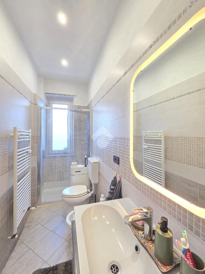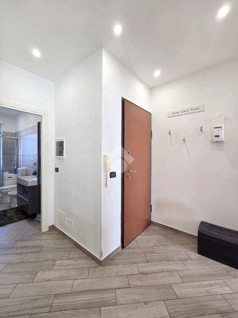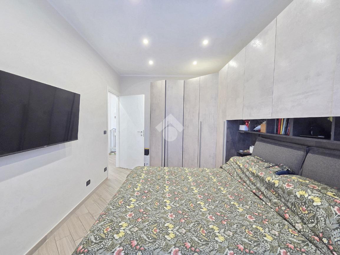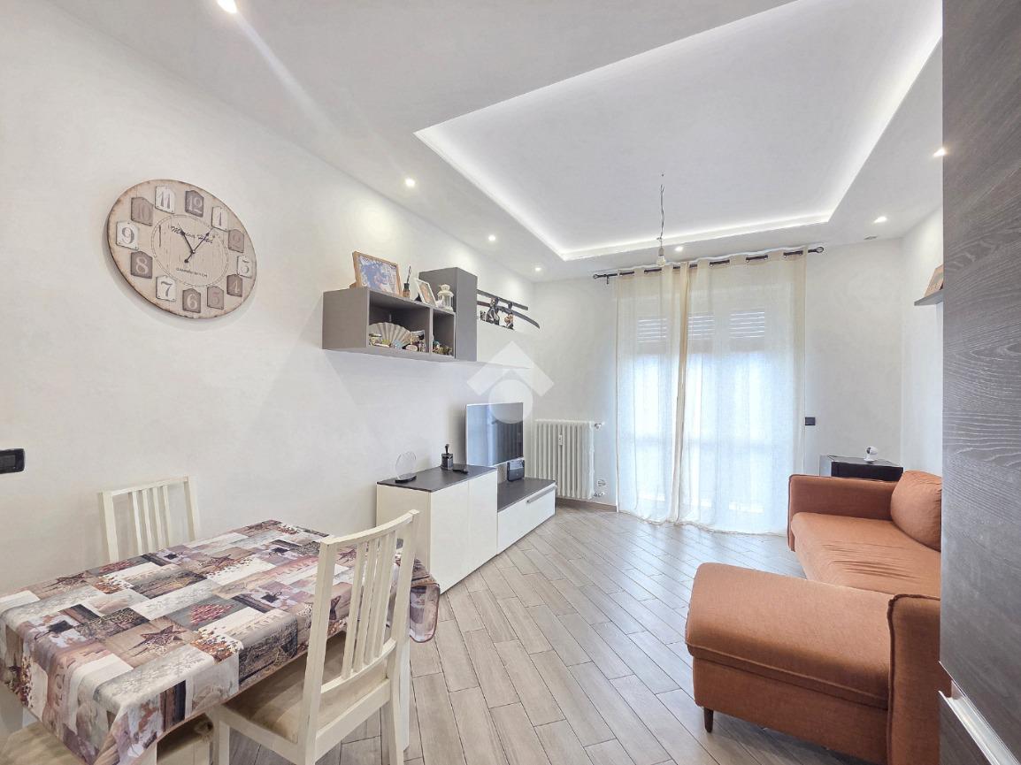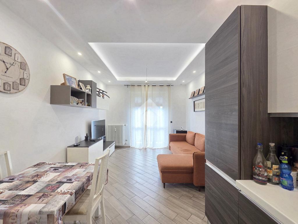 La completa e attenta ristrutturazione ultimata nel 2016, ha visto il rifacimento di tutti gli impianti e il completo stravolgimento degli spazi interni. La zona notte ha preso il posto della zona giorno e viceversa. L'ampio soggiorno living con la cucina angolare a vista, è valorizzato dalla contro soffittatura che ospita, faretti e strisce led. Il primo balcone, raggiungibile dalla zona giorno, affaccia sul lato principale del piccolo condominio. La camera matrimoniale è molto spaziosa, tanto da ospitare l'armadio con la cabina. Anch'essa è valorizzata dalla contro soffittatura con l'illuminazione incassata. Il secondo balcone accessibile da quest'ultima, è stato arricchito dalle tende invernali a rullo e dagli impianti per lavatrice ed asciugatrice. La ristrutturazione ha cambiato anche la struttura del bagno finestrato che, al momento vede i sanitari tutti sullo stesso lato e, al fondo la doccia in cristallo. La seconda camera da letto, adiacente al living, affaccia anch'essa sul lato principale del fabbricato. Tutta la pavimentazione dell'appartamento è omogenea al di fuori del servizio igienico ed è stata posata a 45°. I lavori hanno visto anche la sostituzione di tutti gli infissi esterni, compreso le tapparelle e la loro motorizzazione. E' stato predisposto anche l'impianto di antifurto. Posizionato al secondo ed ultimo piano, l'appartamento possiede una doppia esposizione ed è stato completamente coibentato rispetto al piano sottotetto. La cantina è al piano interrato. Vista la centralissima posizione in cui è ubicato, è particolarmente utile il box in autorimessa di proprietà sullo stesso piano della cantina. Comodo a qualsiasi servizio di prima necessità, sono raggiungibili a piedi anche mezzi pubblici e stazione ferroviaria, oltre a scuole e supermercati.