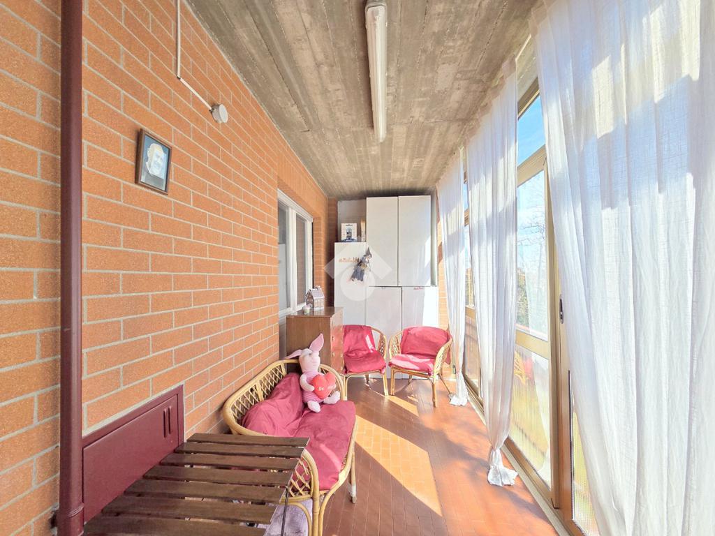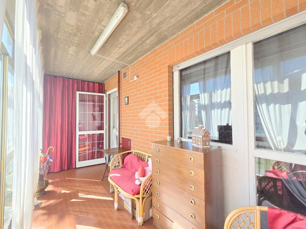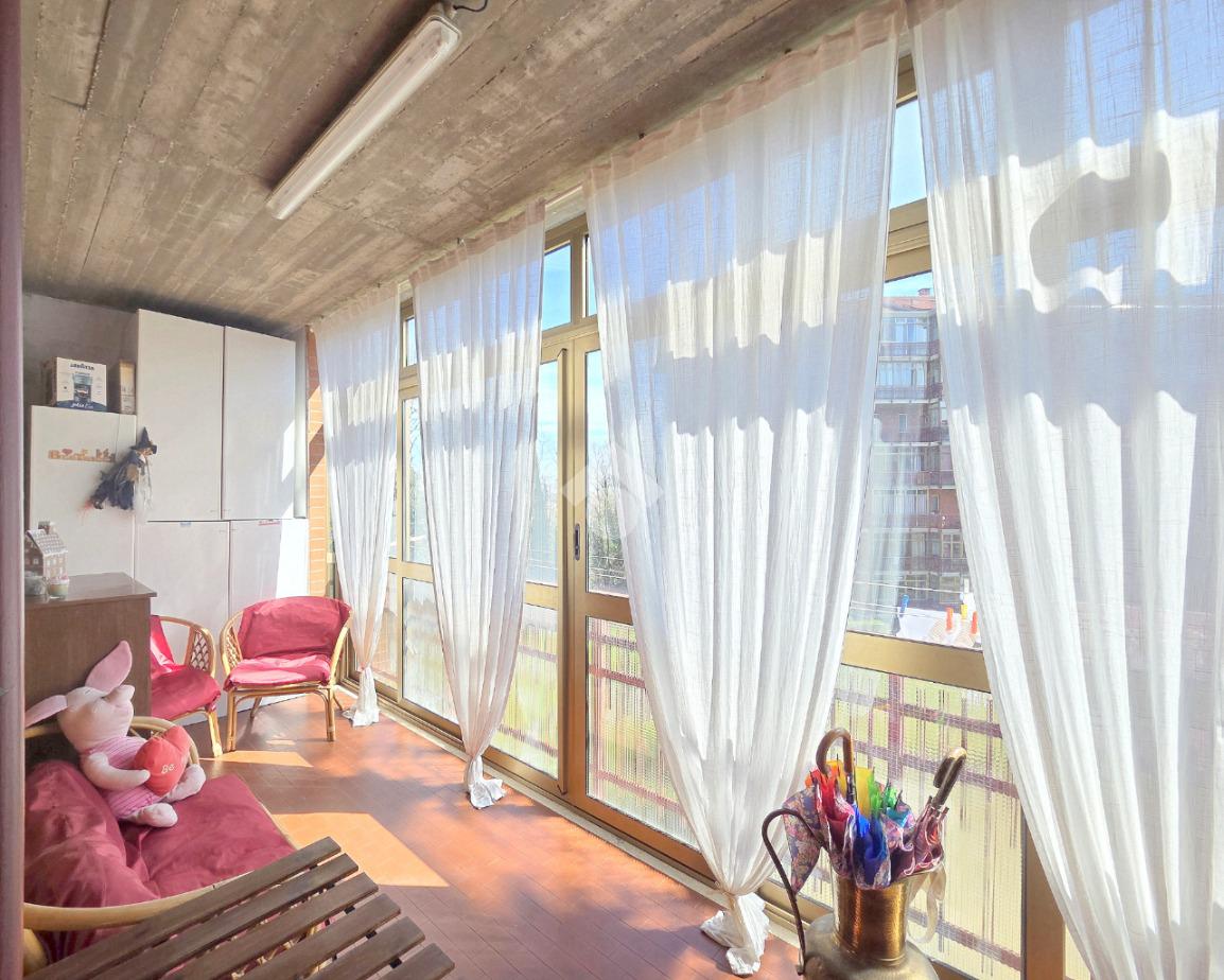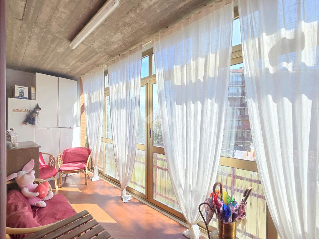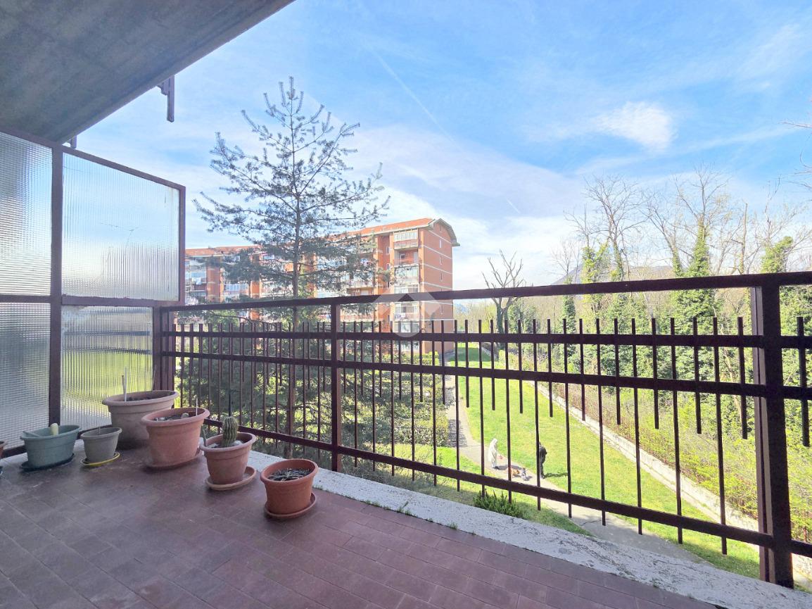 Il soggiorno è particolarmente luminoso grazie al doppio infisso che ospita al suo interno. Da quest'ultimo è possibile utilizzare il terrazzino che offre un piacevole panorama sul monte Musiné e sul grande parco condominiale. L'ingresso dalla porta brindata avviene sul disimpegno dal quale è possibile utilizzare ogni locale dell'appartamento. La cucina abitabile è accessibile attraverso la porta a scrigno che scorre esterna sul tramezzo. Lineare nelle sue pareti la cucina offre l'accesso al terrazzo, particolarmente sfruttabile grazie alla sua dimensione. Riparato dalla lunga vetrata, quest'ultimo ospita il ripostiglio/lavanderia all'interno del quale è stata inserita la caldaia a metano che gestisce il riscaldamento autonomo e l'acqua calda sanitaria, oltre alla presenza della lavatrice. Percorrendo l'ampio disimpegno è raggiungibile la prima camera matrimoniale, generosa negli spazi. Facilmente arredabile su entrambe le pareti, consente l'utilizzo del terrazzo che raggiunge la cucina abitabile. Accanto alla prima camera è presente il bagno finistrato che prende luce dalla terza esposizione, quella angolare. Al suo interno, oltre ai sanitari, trova spazio anche la vasca/doccia. La seconda camera matrimoniale, esattamente di fronte alla prima, possiede le stesse dimensioni. Tutto l'appartamento è stato oggetto di una completa ristrutturazione nel 2000 e, si presenta in perfetto stato di manutenzione. Posizionato al 2º piano rialzato, l'immobile è inserito nella splendida cornice del complesso residenziale di Piazza VIII Marzo. Arricchito dal parco condominiale e privo di barriere architettoniche, il complesso permette di raggiungere ogni servizio senza l'utilizzo dell'auto. A completare la proprietà dell'appartamento, che gode di una tripla esposizione, sono la cantina ed il garage compresi nel prezzo. Ideale per chi desidera vivere nel centro senza rinunciare alla tranquillità abitativa, l'immobile è ubicato in una posizione strategica anche per l'utilizzo di mezzi pubblici e stazione ferroviaria.