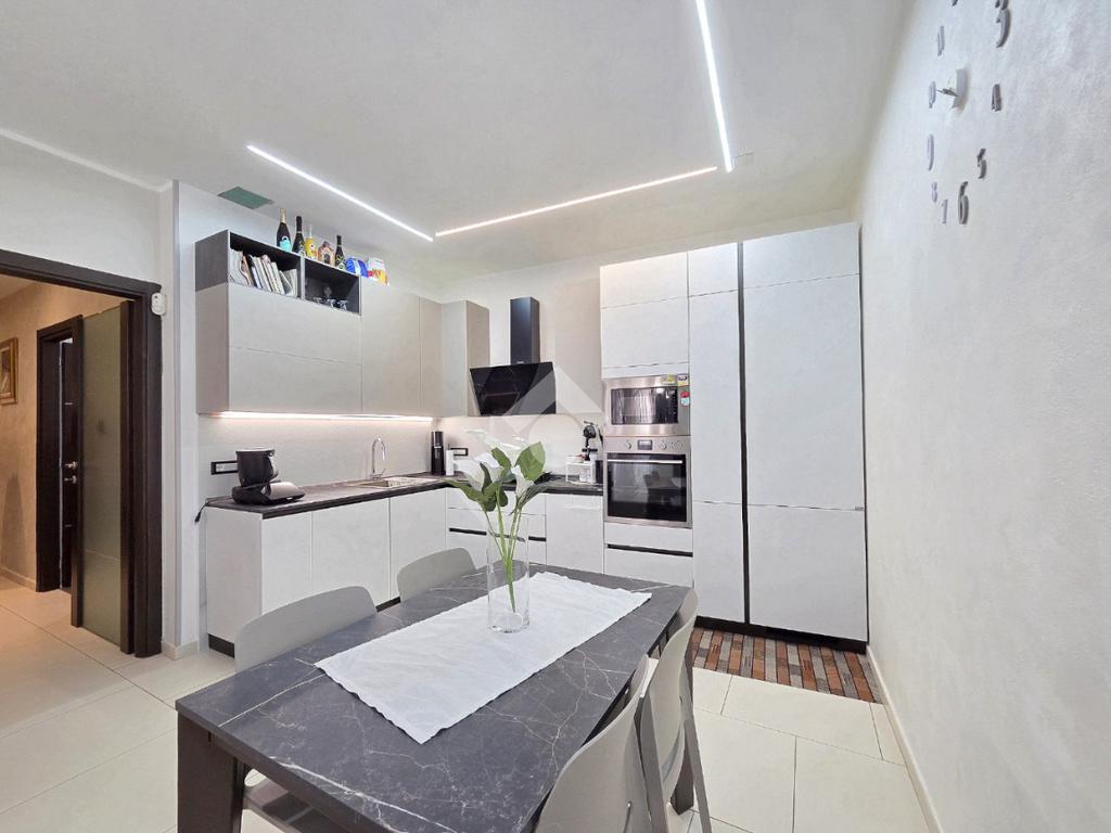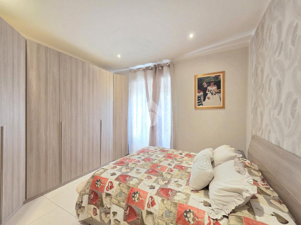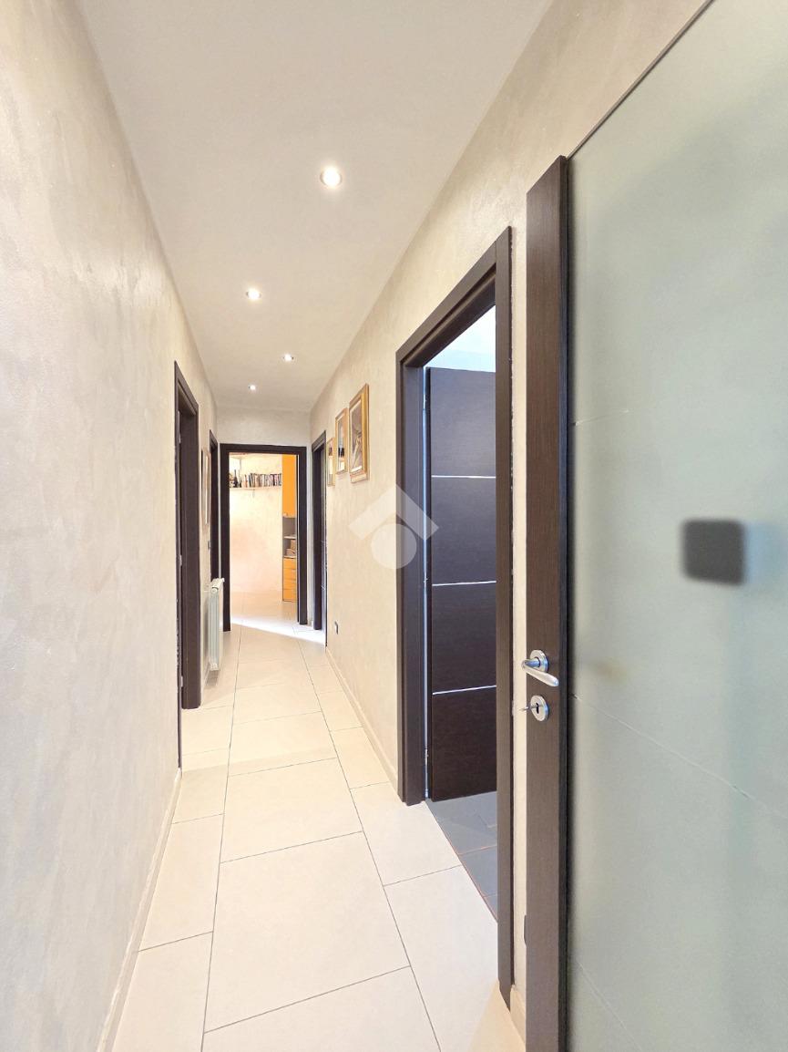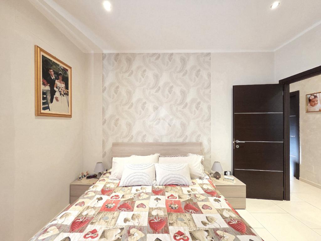 Attraverso la porta blindata veniamo accolti dall'ampio soggiorno living con la cucina angolare a vista. Sicuramente valorizzata dall'illuminazione a led annegata nella controsoffittatura, la zona giorno si presenta ampia e particolarmente funzionale grazie alle lunghe pareti lineari che ospita al suo interno. La zona più lontana è composta dalle due pareti attrezzate ed ospita comodamente tavolo e sedie. Quella più vicina all'ingresso è adibita a soggiorno. All'interno del living, è stato già predisposto l'impianto che permette l'inserimento della stufa a pellet compreso di canna fumaria, collegata all'impianto di riscaldamento. Attualmente il riscaldamento autonomo e l'acqua calda sanitaria sono gestiti dalla caldaia a metano ubicata nel balcone che costeggia la proprietà. Attraverso la porta in cristallo è raggiungibile il corridoio che porta ad ogni locale della zona notte, compreso i doppi servizi. La prima camera matrimoniale possiede una conformazione molto lineare, tanto da ospitare ogni tipologia di mobilio. Adiacente ad essa è posizionato il primo bagno finestrato. Al suo interno, oltre ai sanitari e la vaschetta incassata, trova spazio anche la particolare doccia angolare in cristallo. Accanto al primo bagno è posizionata la seconda camera, anch'essa matrimoniale che ospita 3 punti luce al suo interno, raggiungibile percorrendo il corridoio fino al fondo. Nella stessa zona, attraverso una porta riservata adesso, è utilizzabile il comodo ed ampio ripostiglio. Attualmente utilizzato come tale, il grande ripostiglio potrebbe essere adibito anche a lavanderia poiché è posizionato in aderenza al secondo bagno. Quest'ultimo oltre a sanitari e lavandino, ospita anche gli impianti della lavatrice. Tutta la pavimentazione dell'appartamento è omogenea in ogni locale e, la completa ristrutturazione ha visto anche la sostituzione degli infissi esterni e delle porte interne. Impianti elettrici ed idraulici sono già stati rifatti e, l'immobile si presenta subito abitabile senza necessità di alcun intervento. Posizionato nel centro di Alpignano, permette di poter raggiungere ogni servizio senza l'utilizzo dell'auto. L'assenza di amministratore e di spese condominiali, lo rendono particolarmente interessante.