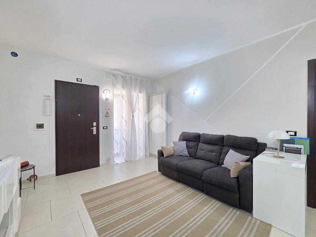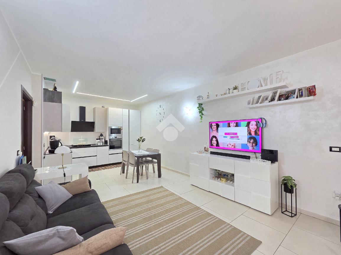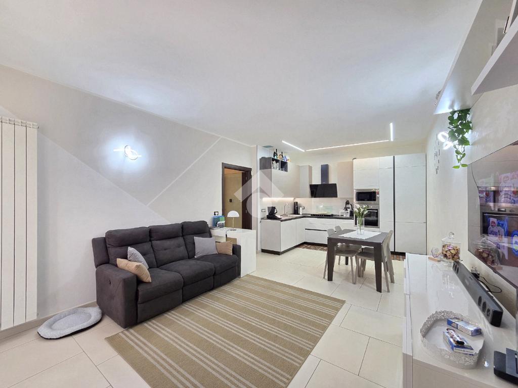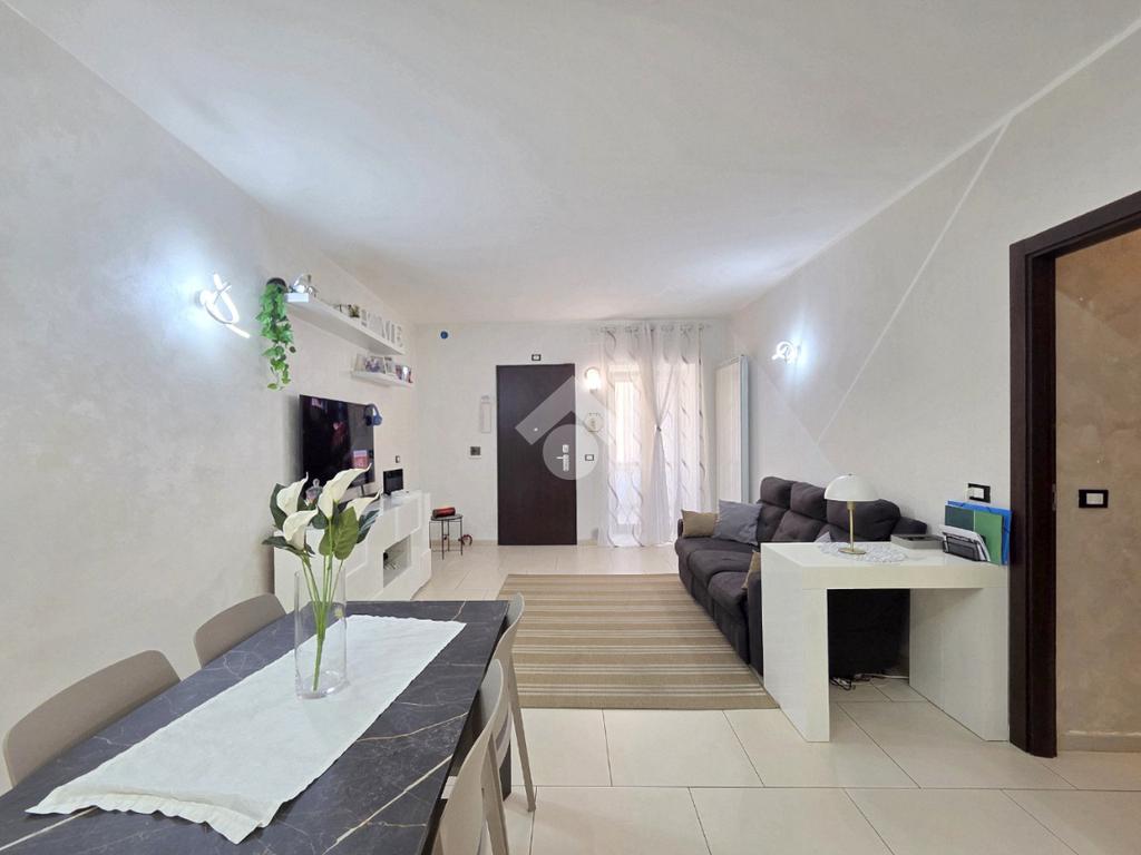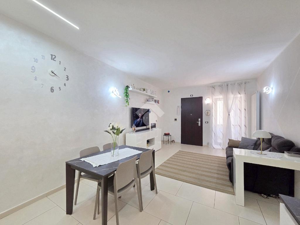 Attraverso la porta blindata veniamo accolti dall'ampio soggiorno living con la cucina angolare a vista. Sicuramente valorizzata dall'illuminazione a led annegata nella controsoffittatura, la zona giorno si presenta ampia e particolarmente funzionale grazie alle lunghe pareti lineari che ospita al suo interno. La zona più lontana è composta dalle due pareti attrezzate ed ospita comodamente tavolo e sedie. Quella più vicina all'ingresso è adibita a soggiorno. All'interno del living, è stato già predisposto l'impianto che permette l'inserimento della stufa a pellet compreso di canna fumaria, collegata all'impianto di riscaldamento. Attualmente il riscaldamento autonomo e l'acqua calda sanitaria sono gestiti dalla caldaia a metano ubicata nel balcone che costeggia la proprietà. Attraverso la porta in cristallo è raggiungibile il corridoio che porta ad ogni locale della zona notte, compreso i doppi servizi. La prima camera matrimoniale possiede una conformazione molto lineare, tanto da ospitare ogni tipologia di mobilio. Adiacente ad essa è posizionato il primo bagno finestrato. Al suo interno, oltre ai sanitari e la vaschetta incassata, trova spazio anche la particolare doccia angolare in cristallo. Accanto al primo bagno è posizionata la seconda camera, anch'essa matrimoniale che ospita 3 punti luce al suo interno, raggiungibile percorrendo il corridoio fino al fondo. Nella stessa zona, attraverso una porta riservata adesso, è utilizzabile il comodo ed ampio ripostiglio. Attualmente utilizzato come tale, il grande ripostiglio potrebbe essere adibito anche a lavanderia poiché è posizionato in aderenza al secondo bagno. Quest'ultimo oltre a sanitari e lavandino, ospita anche gli impianti della lavatrice. Tutta la pavimentazione dell'appartamento è omogenea in ogni locale e, la completa ristrutturazione ha visto anche la sostituzione degli infissi esterni e delle porte interne. Impianti elettrici ed idraulici sono già stati rifatti e, l'immobile si presenta subito abitabile senza necessità di alcun intervento. Posizionato nel centro di Alpignano, permette di poter raggiungere ogni servizio senza l'utilizzo dell'auto. L'assenza di amministratore e di spese condominiali, lo rendono particolarmente interessante.