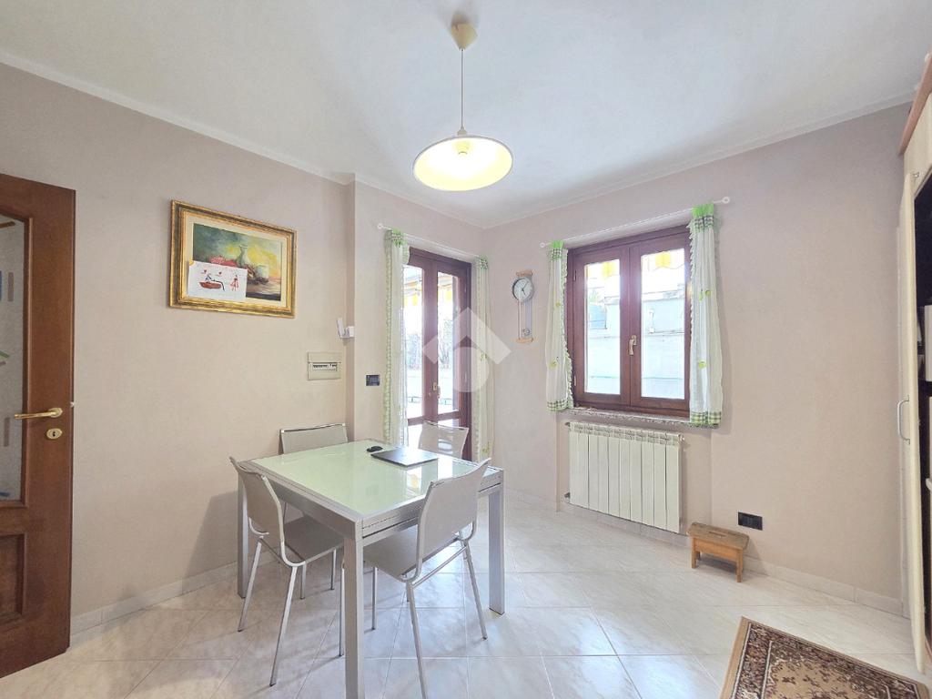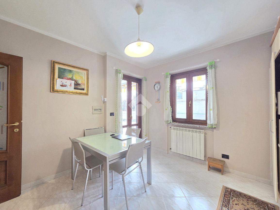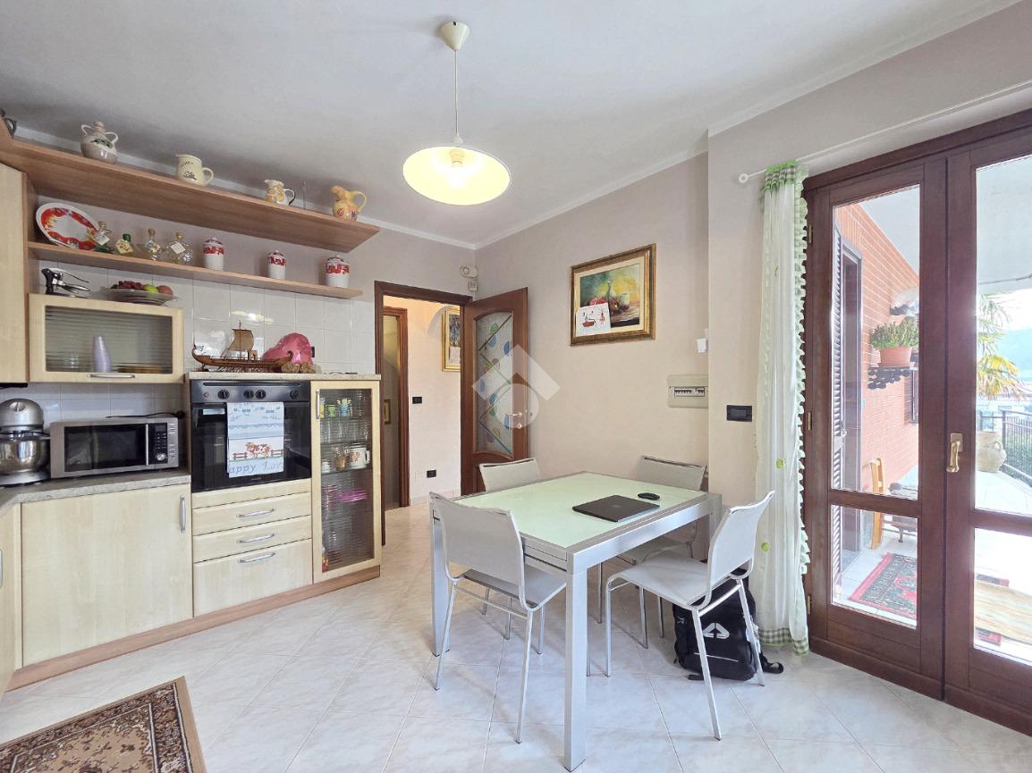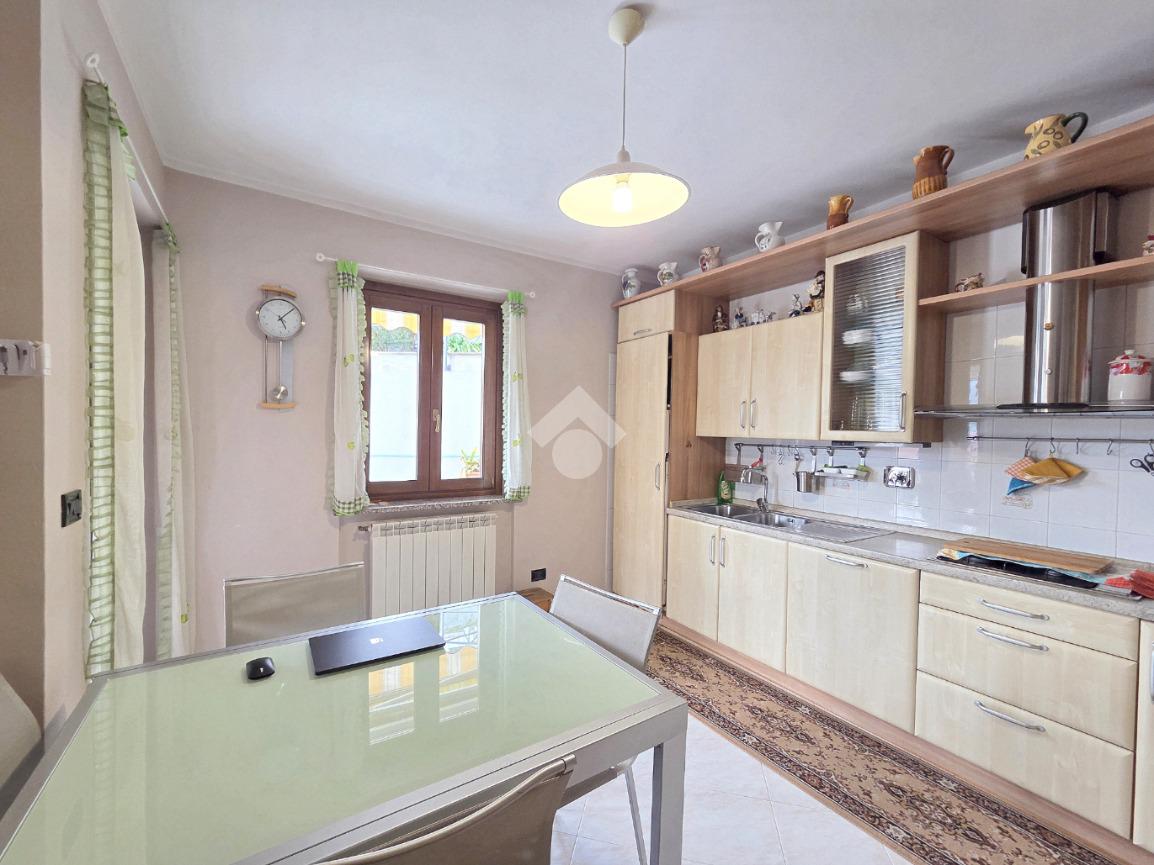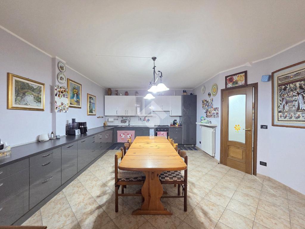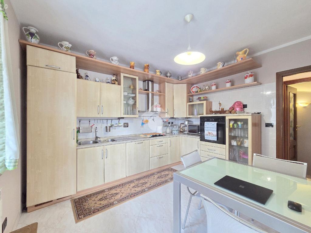 Dal salone, attraverso il funzionale disimpegno, si accede alla cucina abitabile spaziosa e ben organizzata. La metratura ha consentito l’inserimento di un tavolo da pranzo, oltre a una disposizione angolare degli arredi.