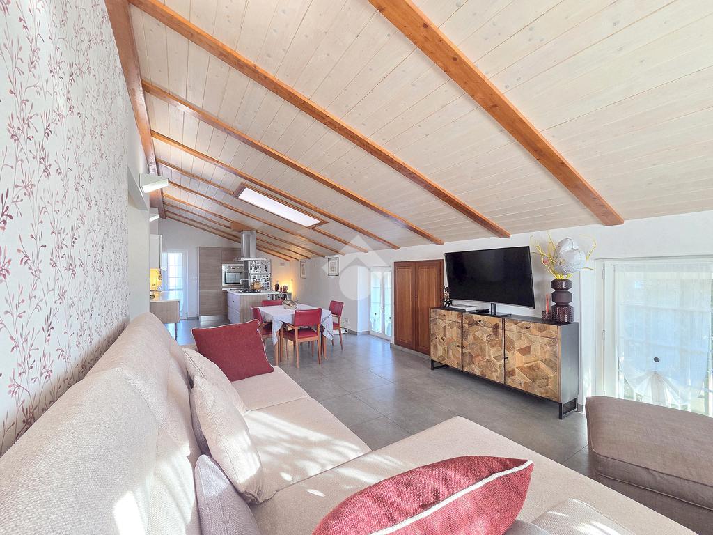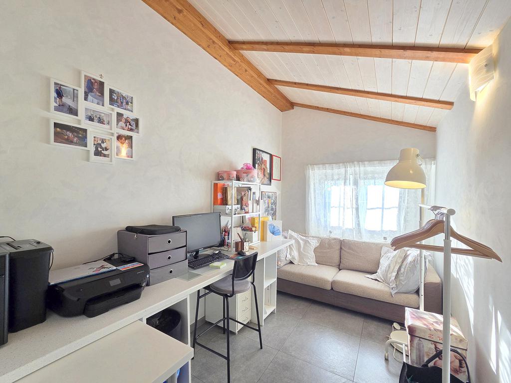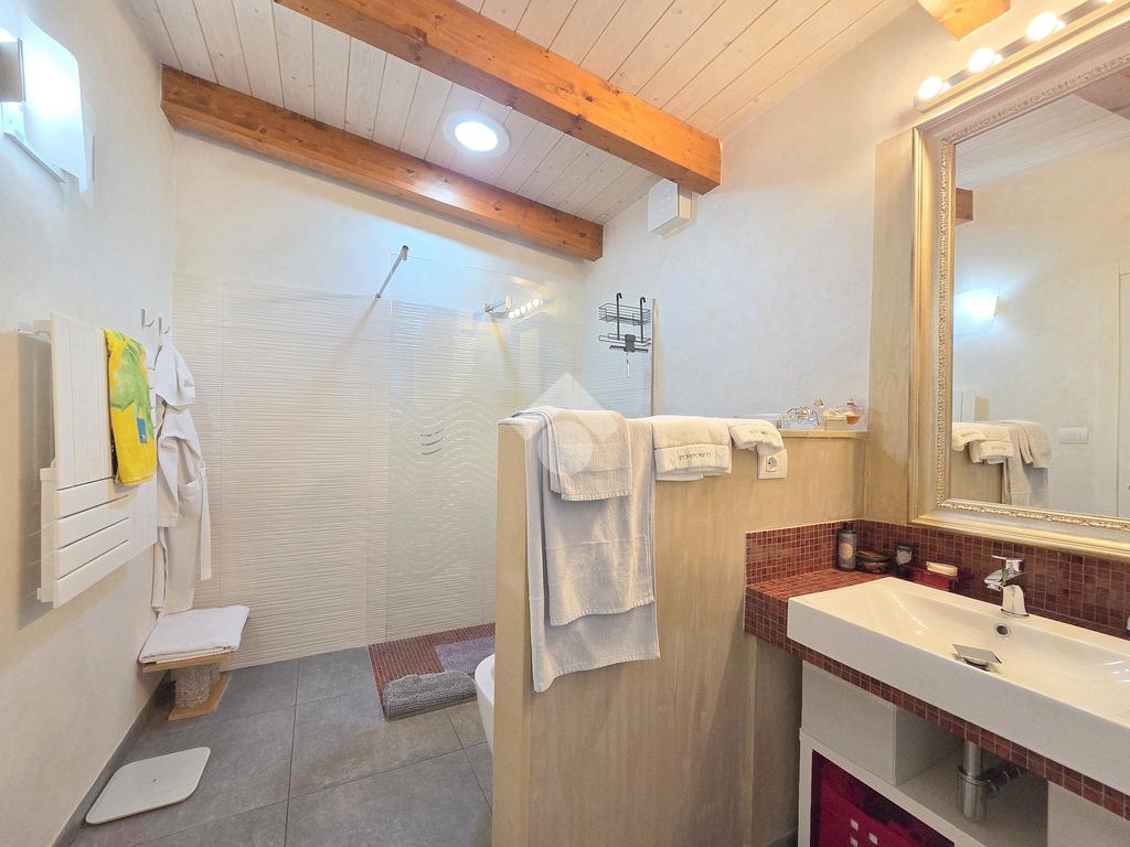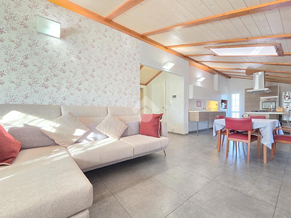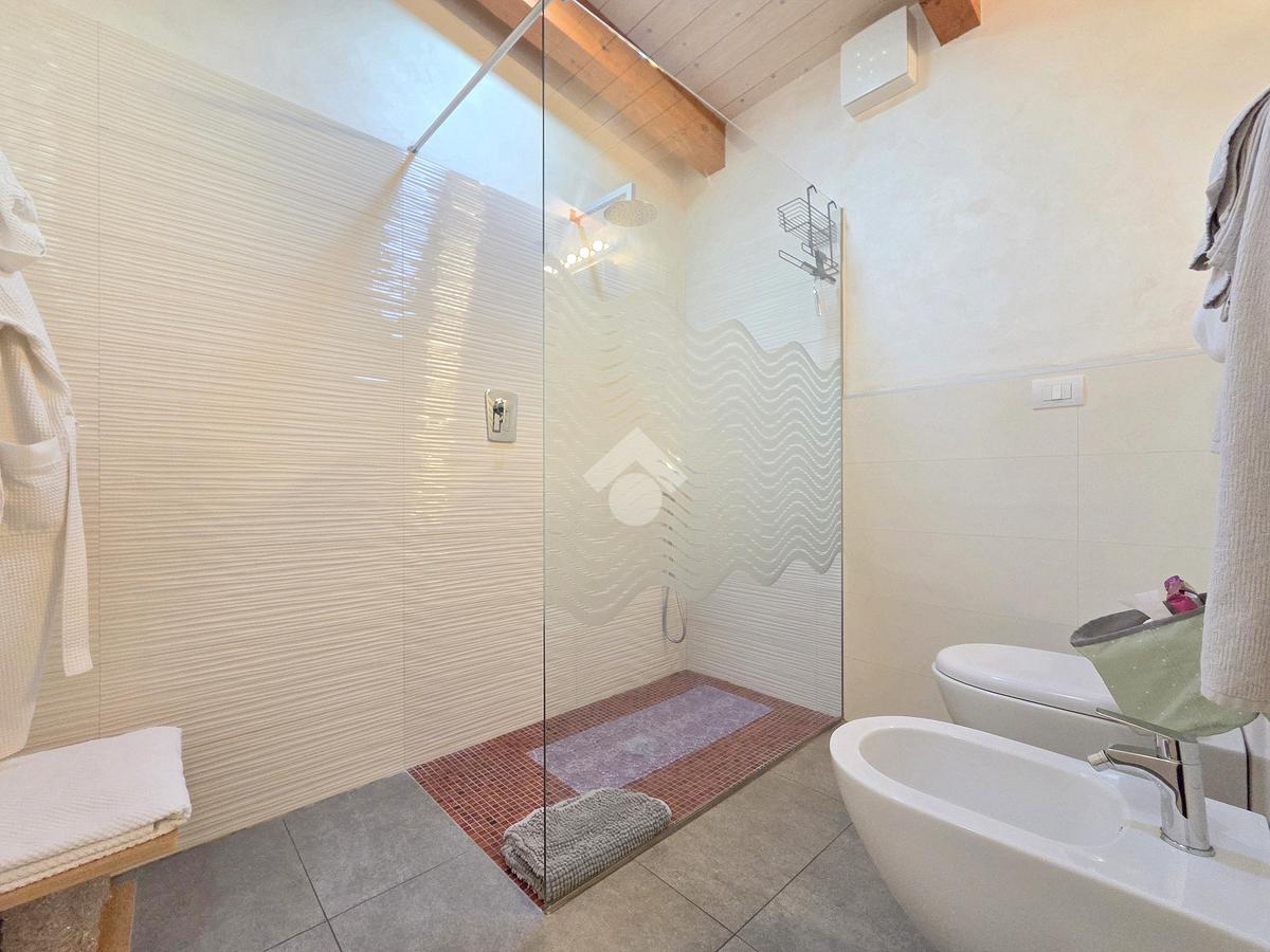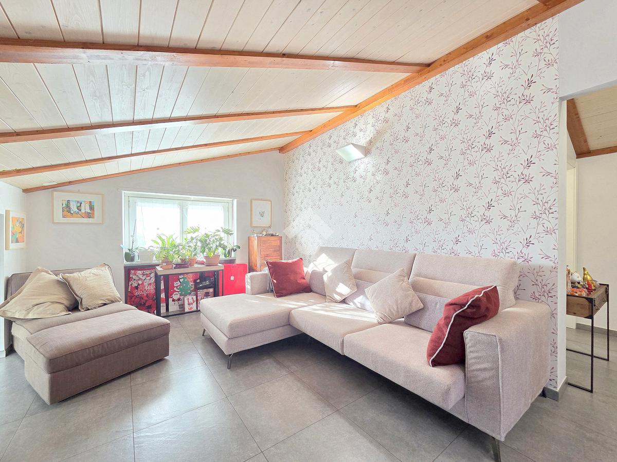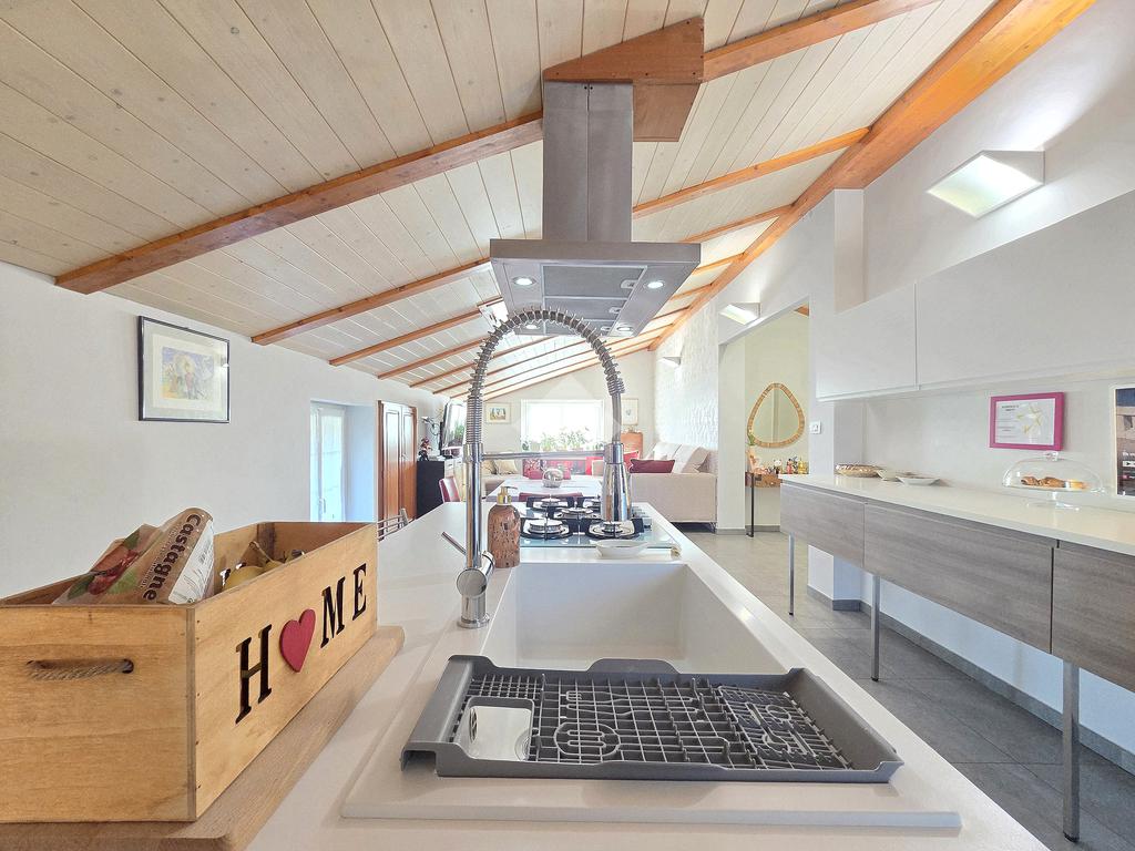 La zona giorno è particolarmente luminosa grazie ai cinque punti luce che ospita al suo interno, tra finestre, porte e finestre e Velux. Valorizzata dalle sue dimensioni che si avvicinano ai 50 metri, quest'ultima consente di percepire la completa e attenta ristrutturazione che ha toccato ogni dettaglio dell'appartamento. Progettata con l'isola centrale che accoglie piano cottura e lavandino, la zona giorno accede al terrazzo abitabile dal quale si gode di una piacevole vista panoramica. Dal lato opposto, il soggiorno doppio, ospita la zona divani e TV con le 2 finestre che la caratterizzano. L'ingresso dalla porta blindata è preceduto dal funzionale ripostiglio sul pianerottolo, che funge da scarpiera e da appendiabiti. Accedendo all'immobile veniamo accolti dal grande disimpegno aperto sulla zona giorno, dal quale è possibile raggiungere la prima delle 3 camere. Finestrata e molto alta nelle sue pareti, quest'ultima è attualmente utilizzata come studio. Attraverso la porta a scrigno, è possibile raggiungere il disimpegno della zona notte che serve le altre 2 camere da letto. La prima, specificatamente ampia, è stata progettata per ospitare la lunga cabina armadi a vista. La seconda, oltre ad accedere allo stesso terrazzo della zona giorno, possiede il bagno privato. Accessibile dalla porta a scomparsa, quest'ultimo è finestrato ed è stato rifinito in modo straordinario. Lavandino e sanitari sospesi sono nel primo ambiente, mentre la doccia walk-in è disimpegnata da un muro di fronte alla finestra. Dallo stesso disimpegno della zona notte, si accede al secondo bagno caratterizzato dalle sue dimensioni. Il lavandino in muratura rifinito in mosaico rosso, confina con il muro che ospita i sanitari sospesi. Di fronte ad essi è presente la doppia doccia in cristallo Walk-in con piatto a filo pavimento, rifinito con lo stesso mosaico del lavandino. Al suo interno, il secondo bagno, ospita anche la comoda lavanderia accessibile da una porta scorrevole. Internamente, oltre al lavello a mano, trovano spazio anche lavatrice ed asciugatrice. Al piano terreno la proprietà comprende anche 2 posti auto scoperti e 2 coperti. Finestrato su tutti e quattro i lati, l'appartamento è posizionato al primo piano rialzato di una villa bifamiliare e possiede il tetto in legno bianco, completamente a vista. Priva di spese condominiali, la villa offre molti spazi comuni ed è ubicata in una posizione ricca di privacy. È possibile acquistare un terreno attiguo alla villa, collegato direttamente alla proprietà ad € 10.000. Il riscaldamento è autonomo a gpl e, i bassi consumi sono stati resi possibili grazie all'attenta coibentazione di tetto e muri perimetrali.