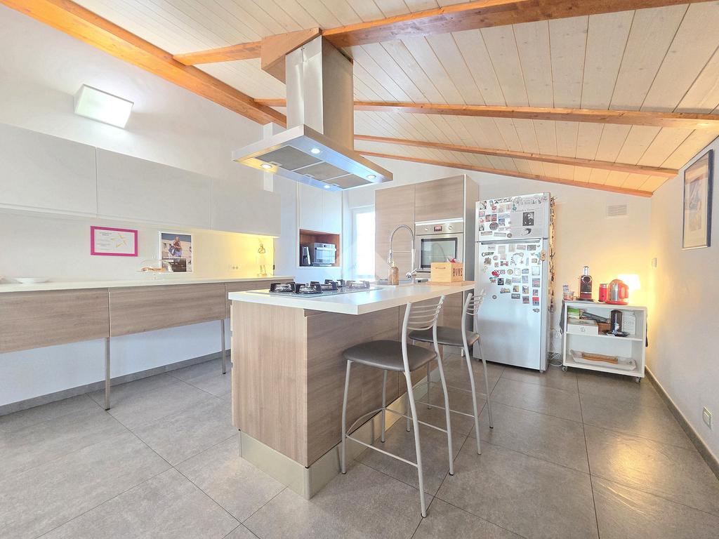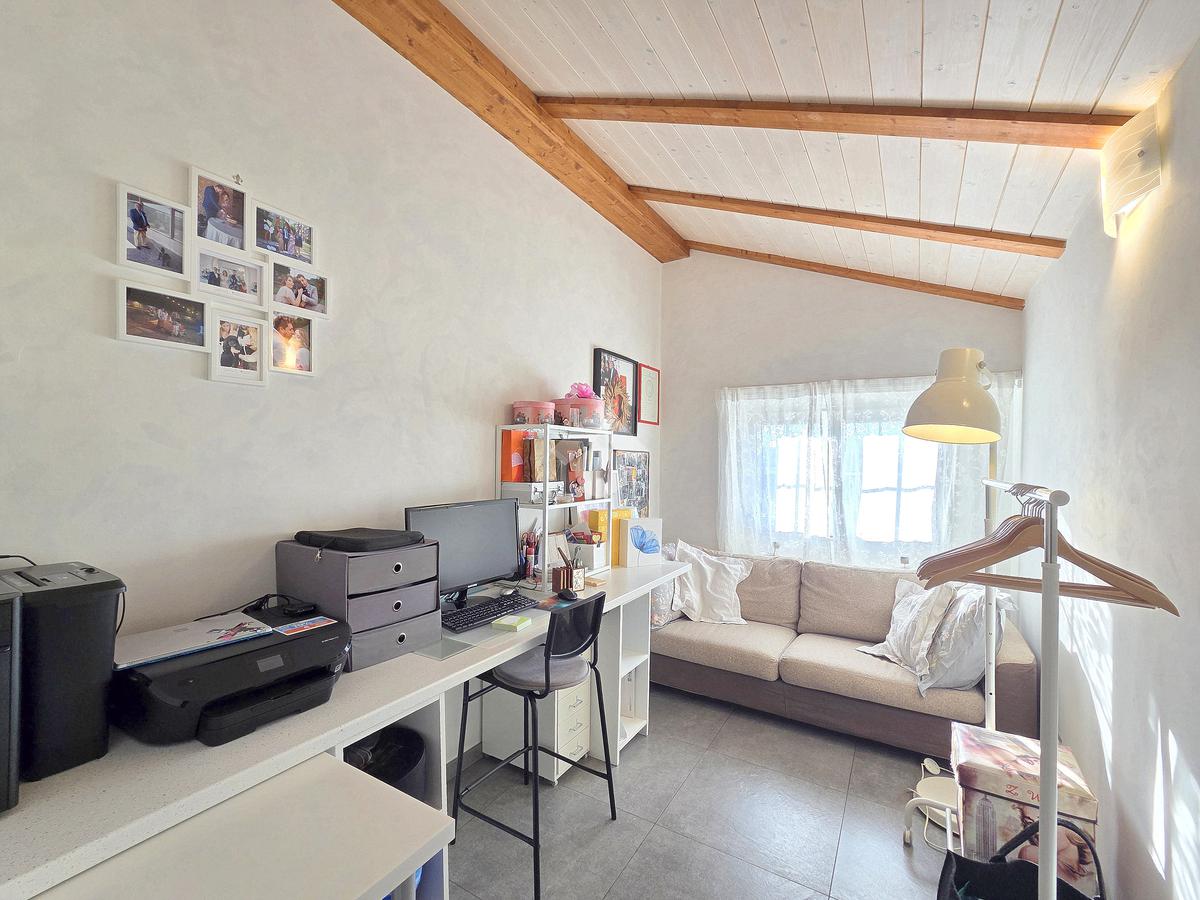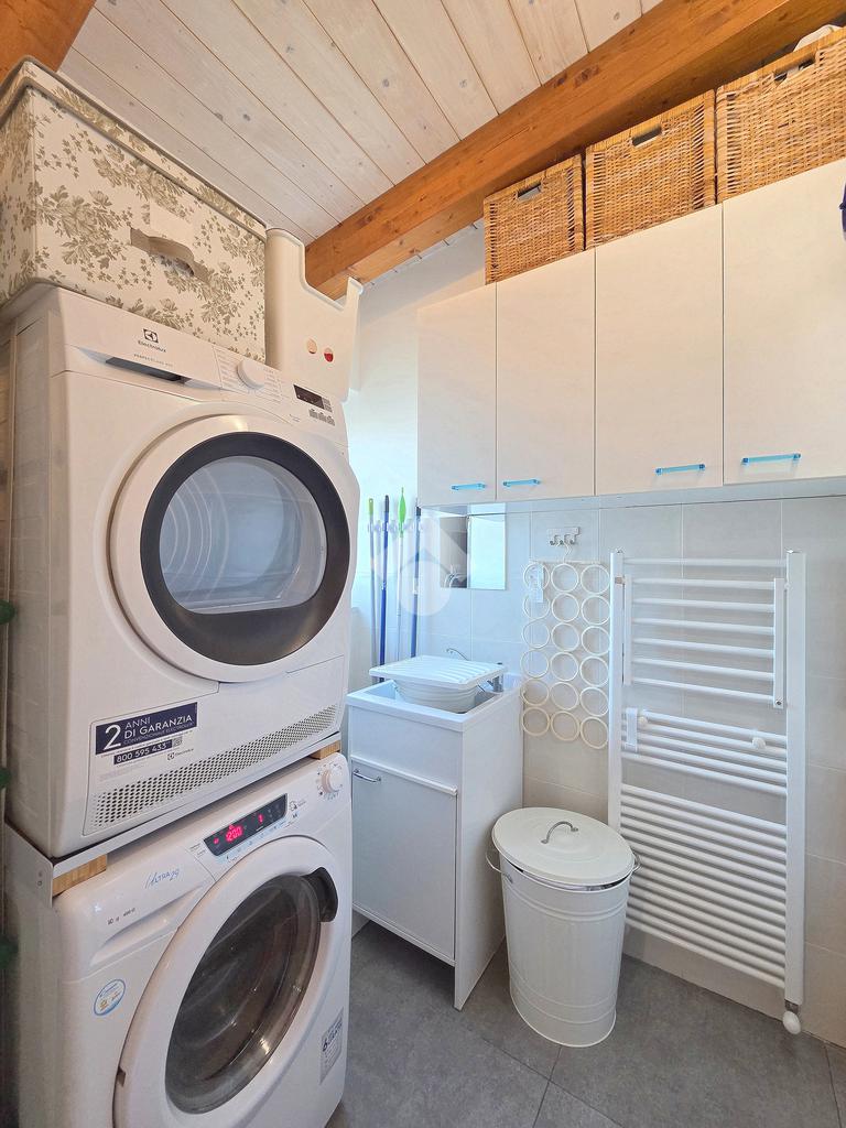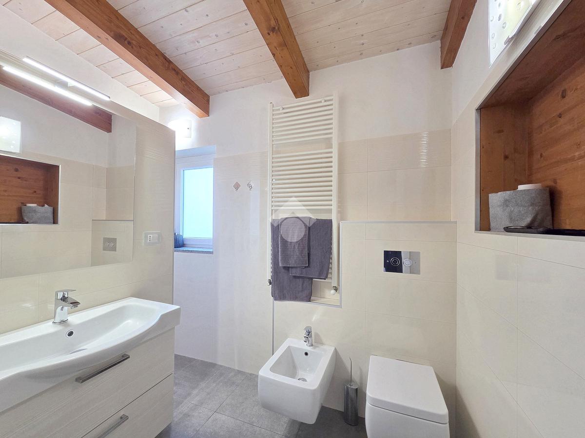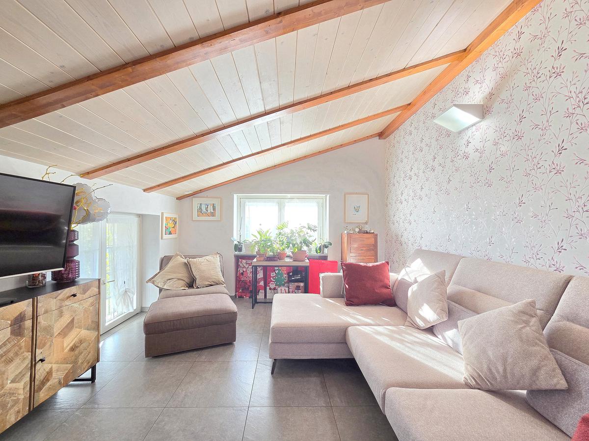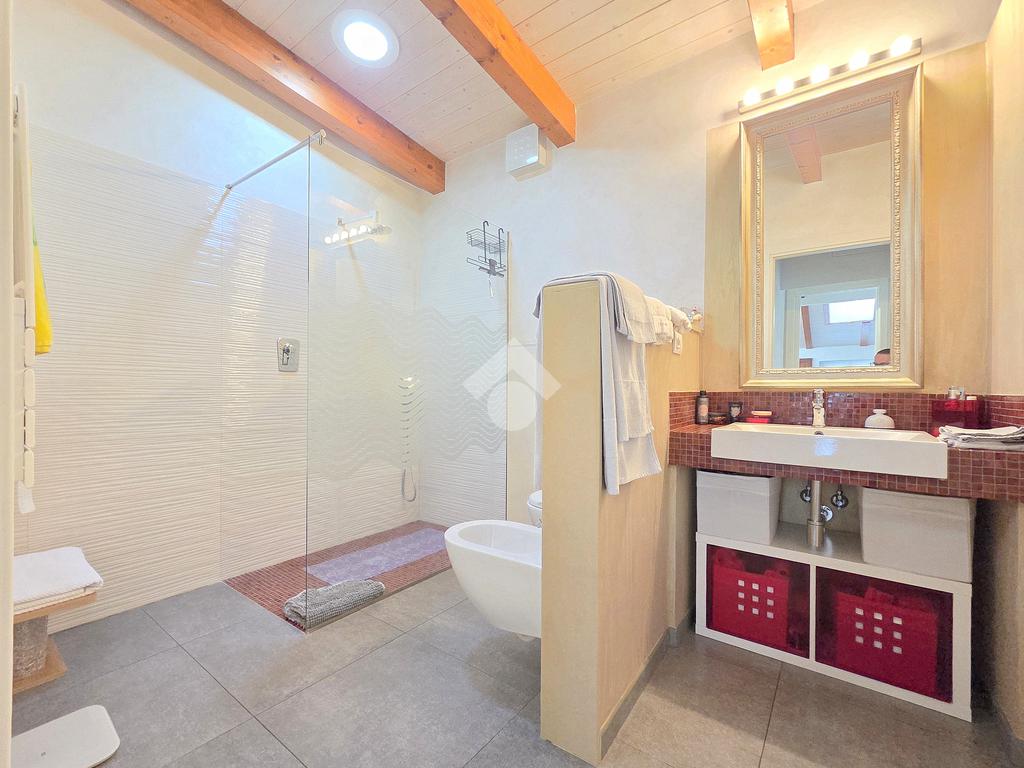 La zona giorno è particolarmente luminosa grazie ai cinque punti luce che ospita al suo interno, tra finestre, porte e finestre e Velux. Valorizzata dalle sue dimensioni che si avvicinano ai 50 metri, quest'ultima consente di percepire la completa e attenta ristrutturazione che ha toccato ogni dettaglio dell'appartamento. Progettata con l'isola centrale che accoglie piano cottura e lavandino, la zona giorno accede al terrazzo abitabile dal quale si gode di una piacevole vista panoramica. Dal lato opposto, il soggiorno doppio, ospita la zona divani e TV con le 2 finestre che la caratterizzano. L'ingresso dalla porta blindata è preceduto dal funzionale ripostiglio sul pianerottolo, che funge da scarpiera e da appendiabiti. Accedendo all'immobile veniamo accolti dal grande disimpegno aperto sulla zona giorno, dal quale è possibile raggiungere la prima delle 3 camere. Finestrata e molto alta nelle sue pareti, quest'ultima è attualmente utilizzata come studio. Attraverso la porta a scrigno, è possibile raggiungere il disimpegno della zona notte che serve le altre 2 camere da letto. La prima, specificatamente ampia, è stata progettata per ospitare la lunga cabina armadi a vista. La seconda, oltre ad accedere allo stesso terrazzo della zona giorno, possiede il bagno privato. Accessibile dalla porta a scomparsa, quest'ultimo è finestrato ed è stato rifinito in modo straordinario. Lavandino e sanitari sospesi sono nel primo ambiente, mentre la doccia walk-in è disimpegnata da un muro di fronte alla finestra. Dallo stesso disimpegno della zona notte, si accede al secondo bagno caratterizzato dalle sue dimensioni. Il lavandino in muratura rifinito in mosaico rosso, confina con il muro che ospita i sanitari sospesi. Di fronte ad essi è presente la doppia doccia in cristallo Walk-in con piatto a filo pavimento, rifinito con lo stesso mosaico del lavandino. Al suo interno, il secondo bagno, ospita anche la comoda lavanderia accessibile da una porta scorrevole. Internamente, oltre al lavello a mano, trovano spazio anche lavatrice ed asciugatrice. Al piano terreno la proprietà comprende anche 2 posti auto scoperti e 2 coperti. Finestrato su tutti e quattro i lati, l'appartamento è posizionato al primo piano rialzato di una villa bifamiliare e possiede il tetto in legno bianco, completamente a vista. Priva di spese condominiali, la villa offre molti spazi comuni ed è ubicata in una posizione ricca di privacy. È possibile acquistare un terreno attiguo alla villa, collegato direttamente alla proprietà ad € 10.000. Il riscaldamento è autonomo a gpl e, i bassi consumi sono stati resi possibili grazie all'attenta coibentazione di tetto e muri perimetrali.