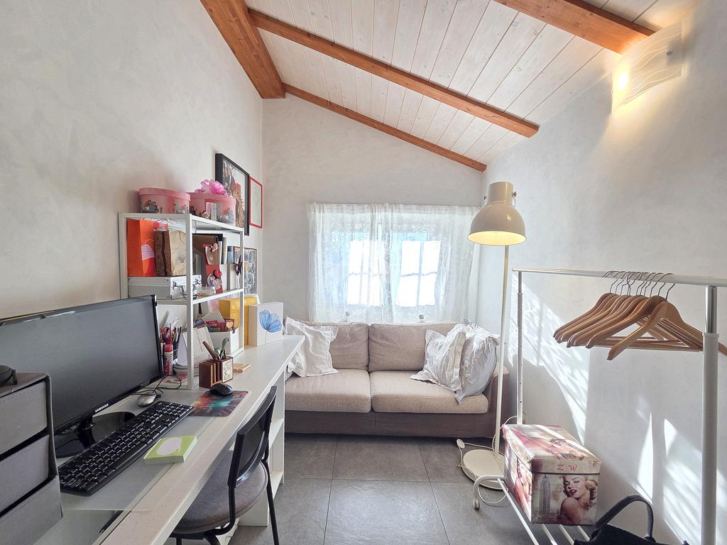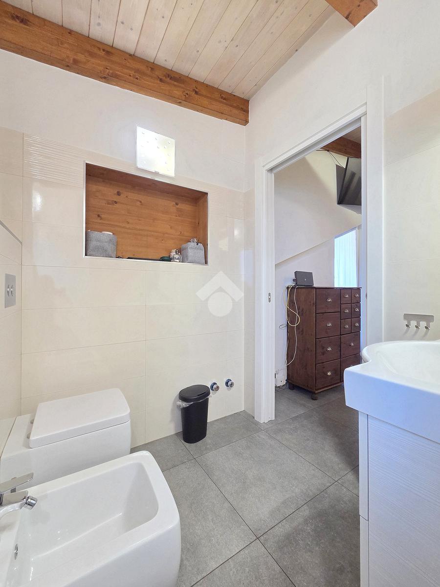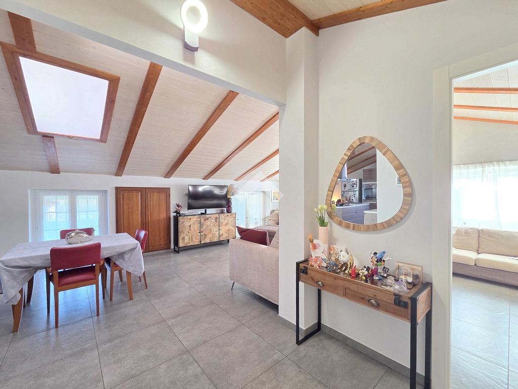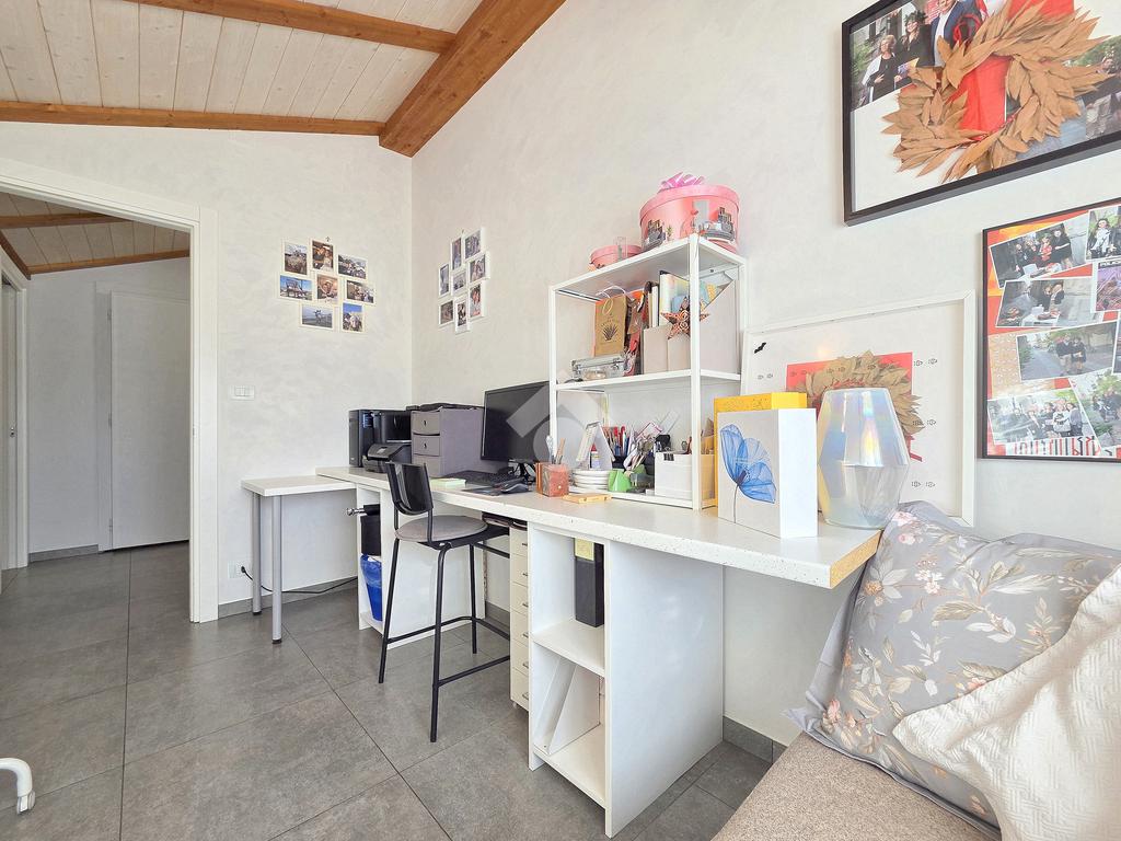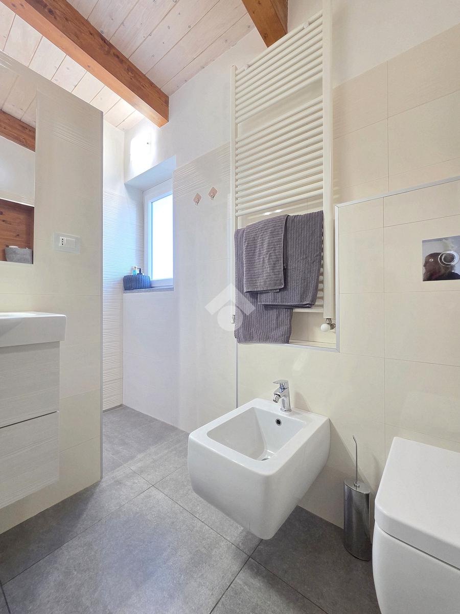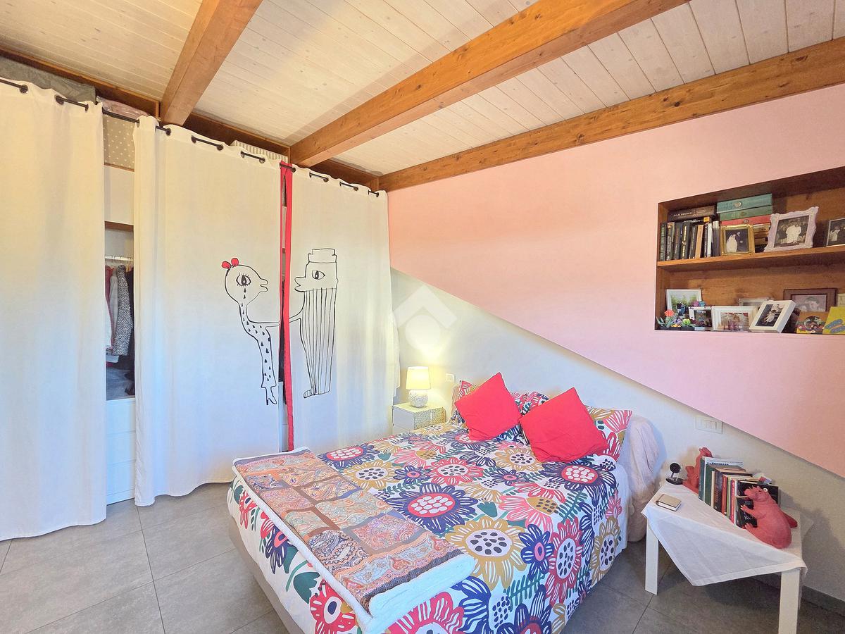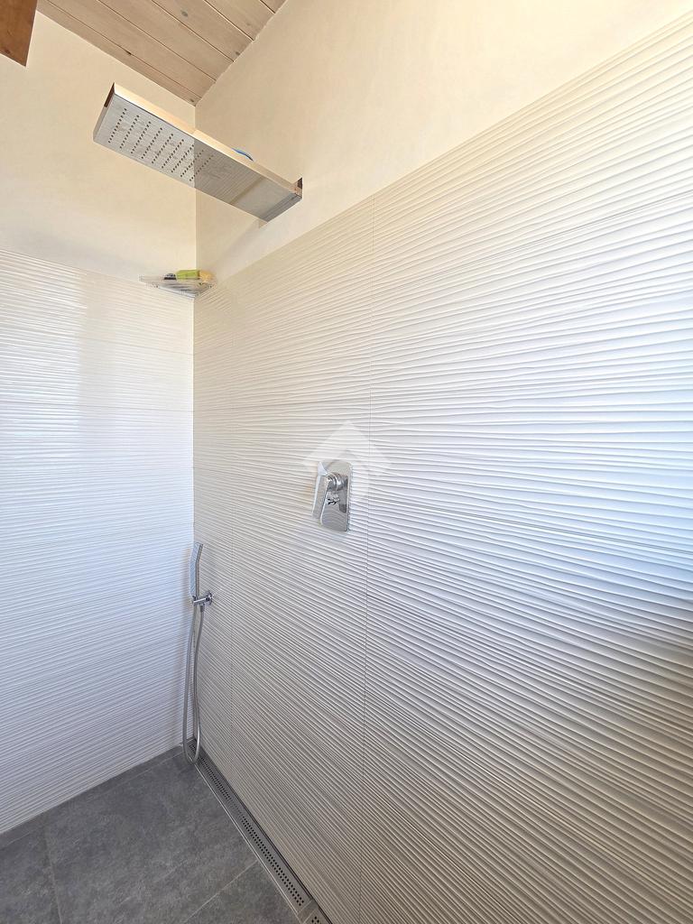 La zona giorno è particolarmente luminosa grazie ai cinque punti luce che ospita al suo interno, tra finestre, porte e finestre e Velux. Valorizzata dalle sue dimensioni che si avvicinano ai 50 metri, quest'ultima consente di percepire la completa e attenta ristrutturazione che ha toccato ogni dettaglio dell'appartamento. Progettata con l'isola centrale che accoglie piano cottura e lavandino, la zona giorno accede al terrazzo abitabile dal quale si gode di una piacevole vista panoramica. Dal lato opposto, il soggiorno doppio, ospita la zona divani e TV con le 2 finestre che la caratterizzano. L'ingresso dalla porta blindata è preceduto dal funzionale ripostiglio sul pianerottolo, che funge da scarpiera e da appendiabiti. Accedendo all'immobile veniamo accolti dal grande disimpegno aperto sulla zona giorno, dal quale è possibile raggiungere la prima delle 3 camere. Finestrata e molto alta nelle sue pareti, quest'ultima è attualmente utilizzata come studio. Attraverso la porta a scrigno, è possibile raggiungere il disimpegno della zona notte che serve le altre 2 camere da letto. La prima, specificatamente ampia, è stata progettata per ospitare la lunga cabina armadi a vista. La seconda, oltre ad accedere allo stesso terrazzo della zona giorno, possiede il bagno privato. Accessibile dalla porta a scomparsa, quest'ultimo è finestrato ed è stato rifinito in modo straordinario. Lavandino e sanitari sospesi sono nel primo ambiente, mentre la doccia walk-in è disimpegnata da un muro di fronte alla finestra. Dallo stesso disimpegno della zona notte, si accede al secondo bagno caratterizzato dalle sue dimensioni. Il lavandino in muratura rifinito in mosaico rosso, confina con il muro che ospita i sanitari sospesi. Di fronte ad essi è presente la doppia doccia in cristallo Walk-in con piatto a filo pavimento, rifinito con lo stesso mosaico del lavandino. Al suo interno, il secondo bagno, ospita anche la comoda lavanderia accessibile da una porta scorrevole. Internamente, oltre al lavello a mano, trovano spazio anche lavatrice ed asciugatrice. Al piano terreno la proprietà comprende anche 2 posti auto scoperti e 2 coperti. Finestrato su tutti e quattro i lati, l'appartamento è posizionato al primo piano rialzato di una villa bifamiliare e possiede il tetto in legno bianco, completamente a vista. Priva di spese condominiali, la villa offre molti spazi comuni ed è ubicata in una posizione ricca di privacy. È possibile acquistare un terreno attiguo alla villa, collegato direttamente alla proprietà ad € 10.000. Il riscaldamento è autonomo a gpl e, i bassi consumi sono stati resi possibili grazie all'attenta coibentazione di tetto e muri perimetrali.