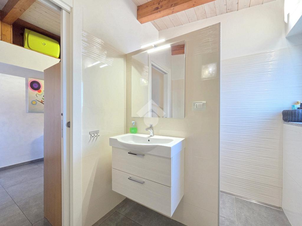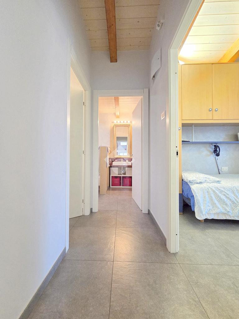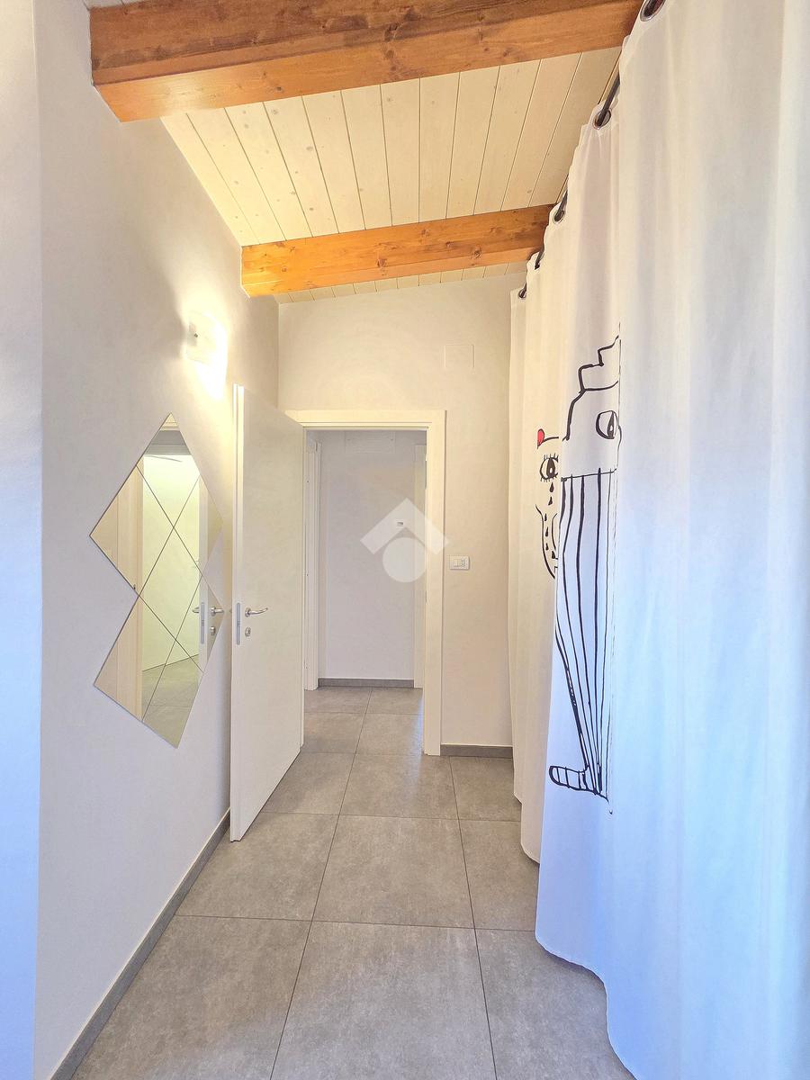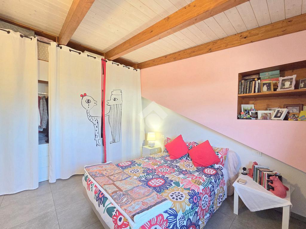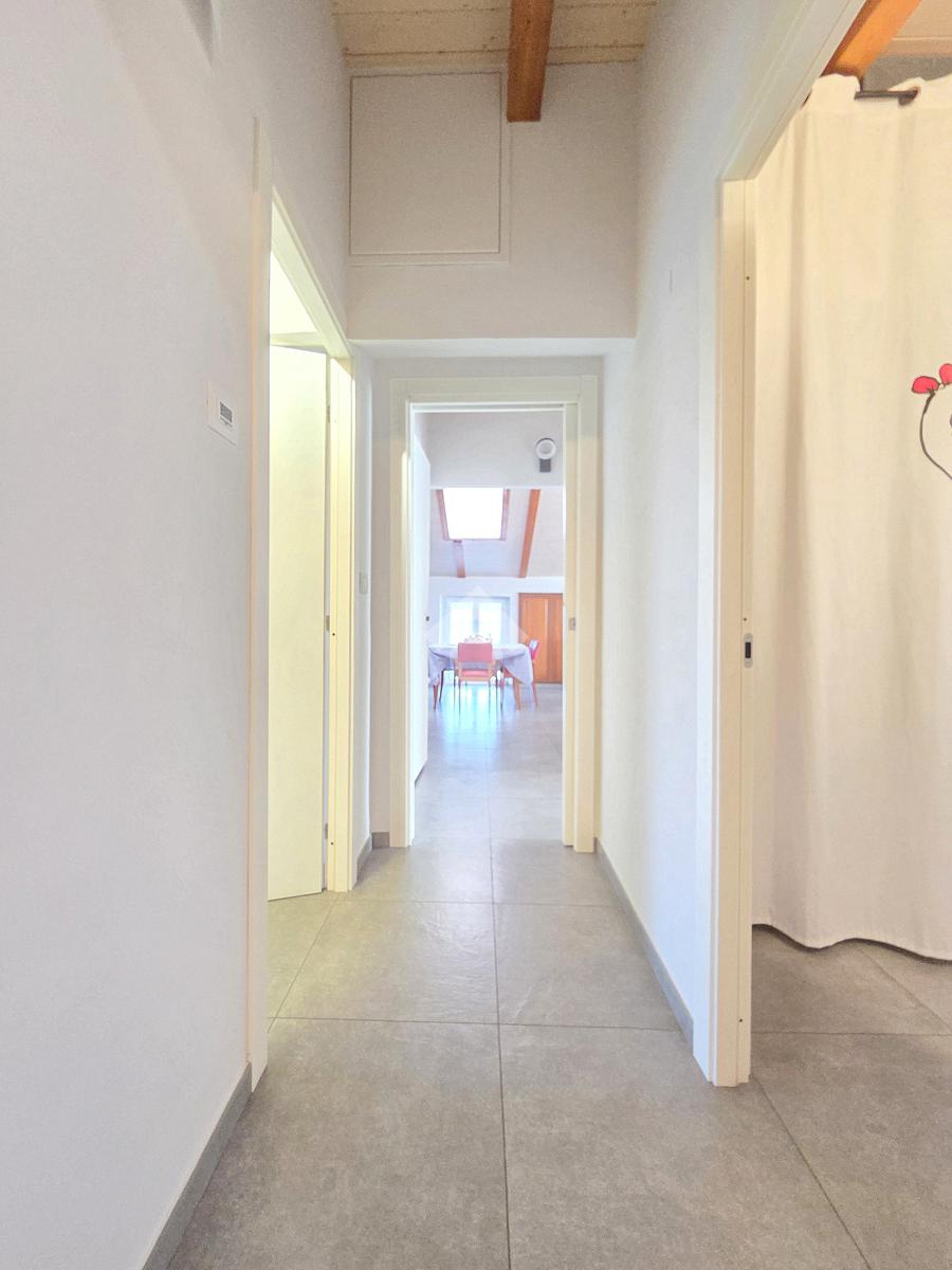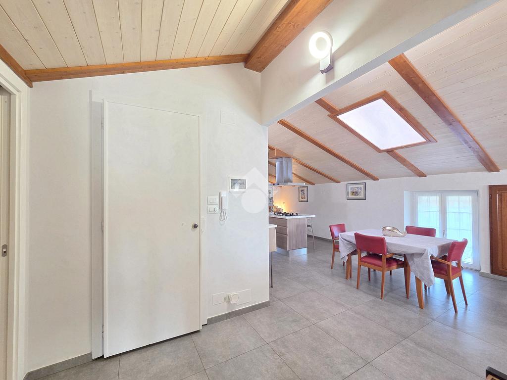 La zona giorno è particolarmente luminosa grazie ai cinque punti luce che ospita al suo interno, tra finestre, porte e finestre e Velux. Valorizzata dalle sue dimensioni che si avvicinano ai 50 metri, quest'ultima consente di percepire la completa e attenta ristrutturazione che ha toccato ogni dettaglio dell'appartamento. Progettata con l'isola centrale che accoglie piano cottura e lavandino, la zona giorno accede al terrazzo abitabile dal quale si gode di una piacevole vista panoramica. Dal lato opposto, il soggiorno doppio, ospita la zona divani e TV con le 2 finestre che la caratterizzano. L'ingresso dalla porta blindata è preceduto dal funzionale ripostiglio sul pianerottolo, che funge da scarpiera e da appendiabiti. Accedendo all'immobile veniamo accolti dal grande disimpegno aperto sulla zona giorno, dal quale è possibile raggiungere la prima delle 3 camere. Finestrata e molto alta nelle sue pareti, quest'ultima è attualmente utilizzata come studio. Attraverso la porta a scrigno, è possibile raggiungere il disimpegno della zona notte che serve le altre 2 camere da letto. La prima, specificatamente ampia, è stata progettata per ospitare la lunga cabina armadi a vista. La seconda, oltre ad accedere allo stesso terrazzo della zona giorno, possiede il bagno privato. Accessibile dalla porta a scomparsa, quest'ultimo è finestrato ed è stato rifinito in modo straordinario. Lavandino e sanitari sospesi sono nel primo ambiente, mentre la doccia walk-in è disimpegnata da un muro di fronte alla finestra. Dallo stesso disimpegno della zona notte, si accede al secondo bagno caratterizzato dalle sue dimensioni. Il lavandino in muratura rifinito in mosaico rosso, confina con il muro che ospita i sanitari sospesi. Di fronte ad essi è presente la doppia doccia in cristallo Walk-in con piatto a filo pavimento, rifinito con lo stesso mosaico del lavandino. Al suo interno, il secondo bagno, ospita anche la comoda lavanderia accessibile da una porta scorrevole. Internamente, oltre al lavello a mano, trovano spazio anche lavatrice ed asciugatrice. Al piano terreno la proprietà comprende anche 2 posti auto scoperti e 2 coperti. Finestrato su tutti e quattro i lati, l'appartamento è posizionato al primo piano rialzato di una villa bifamiliare e possiede il tetto in legno bianco, completamente a vista. Priva di spese condominiali, la villa offre molti spazi comuni ed è ubicata in una posizione ricca di privacy. È possibile acquistare un terreno attiguo alla villa, collegato direttamente alla proprietà ad € 10.000. Il riscaldamento è autonomo a gpl e, i bassi consumi sono stati resi possibili grazie all'attenta coibentazione di tetto e muri perimetrali.