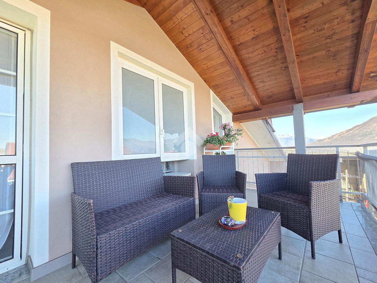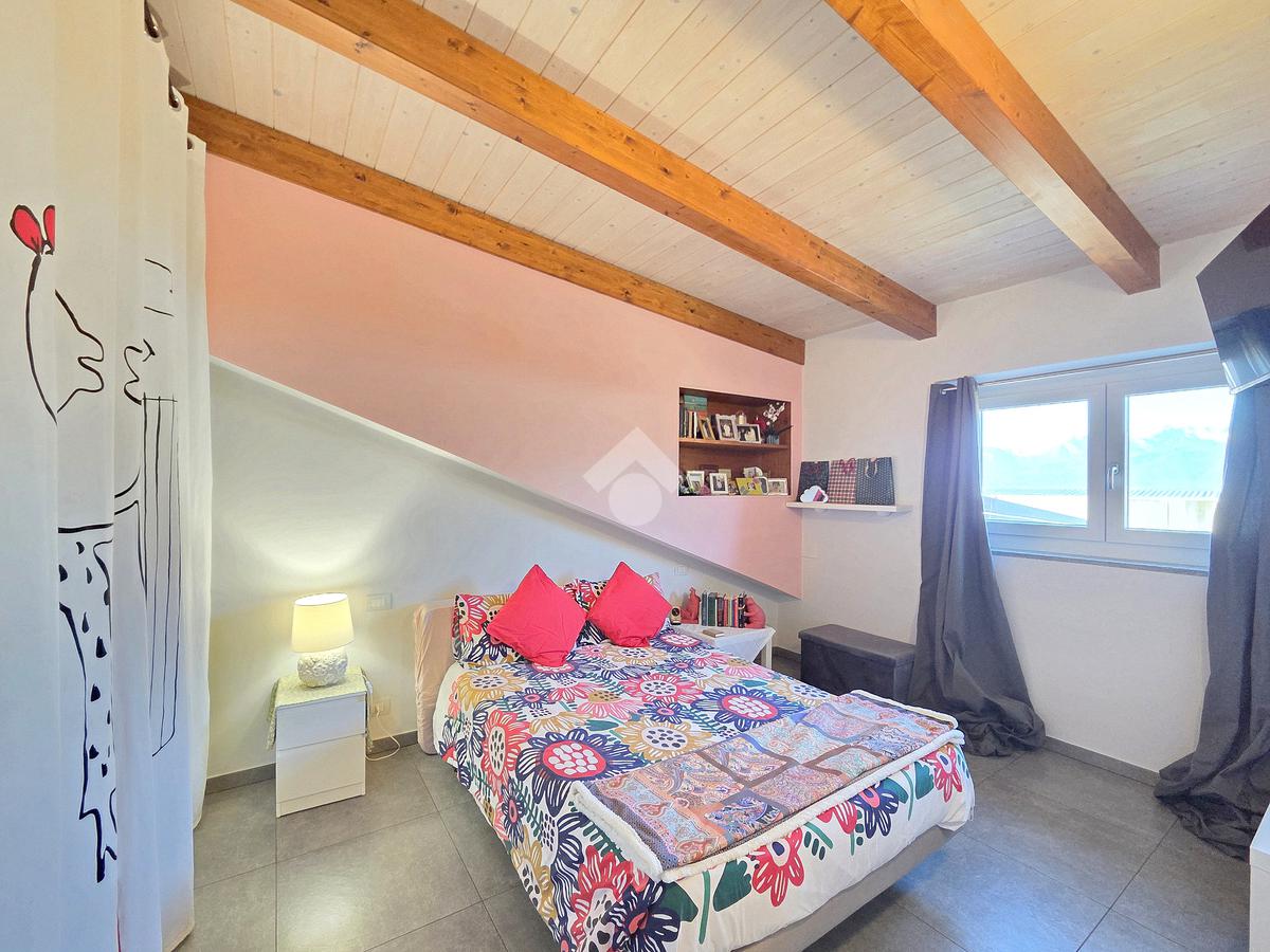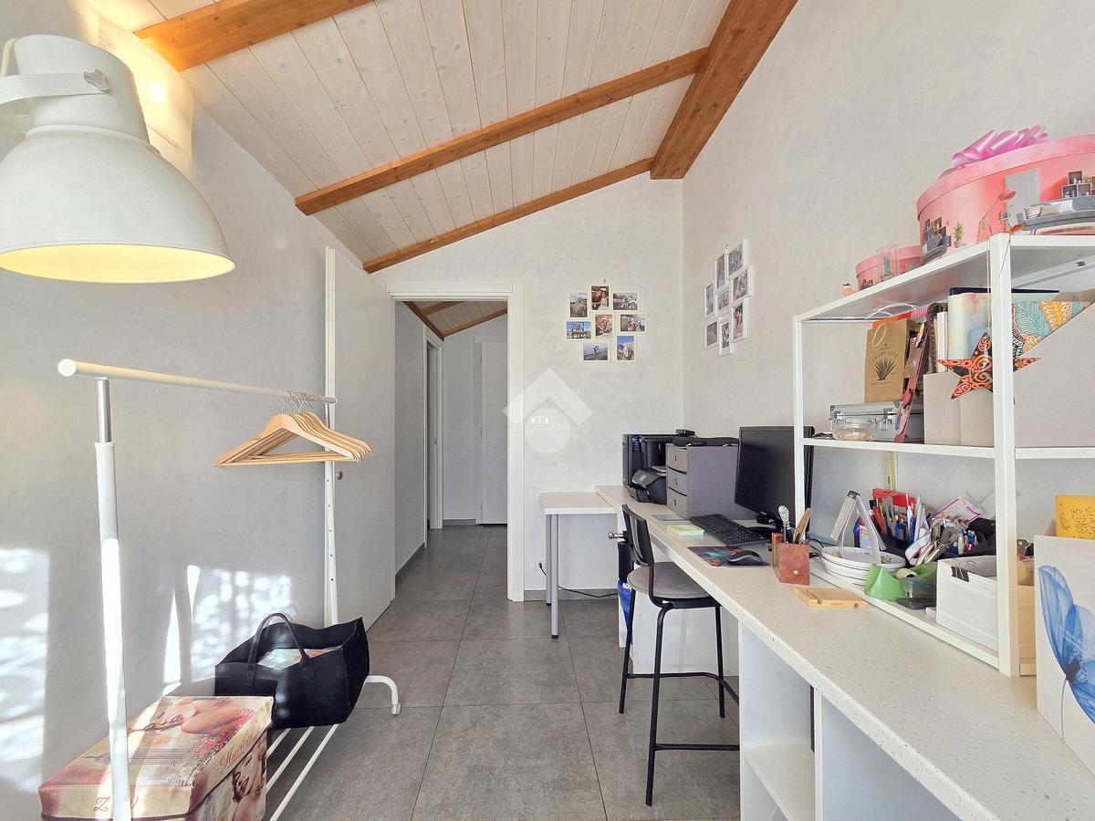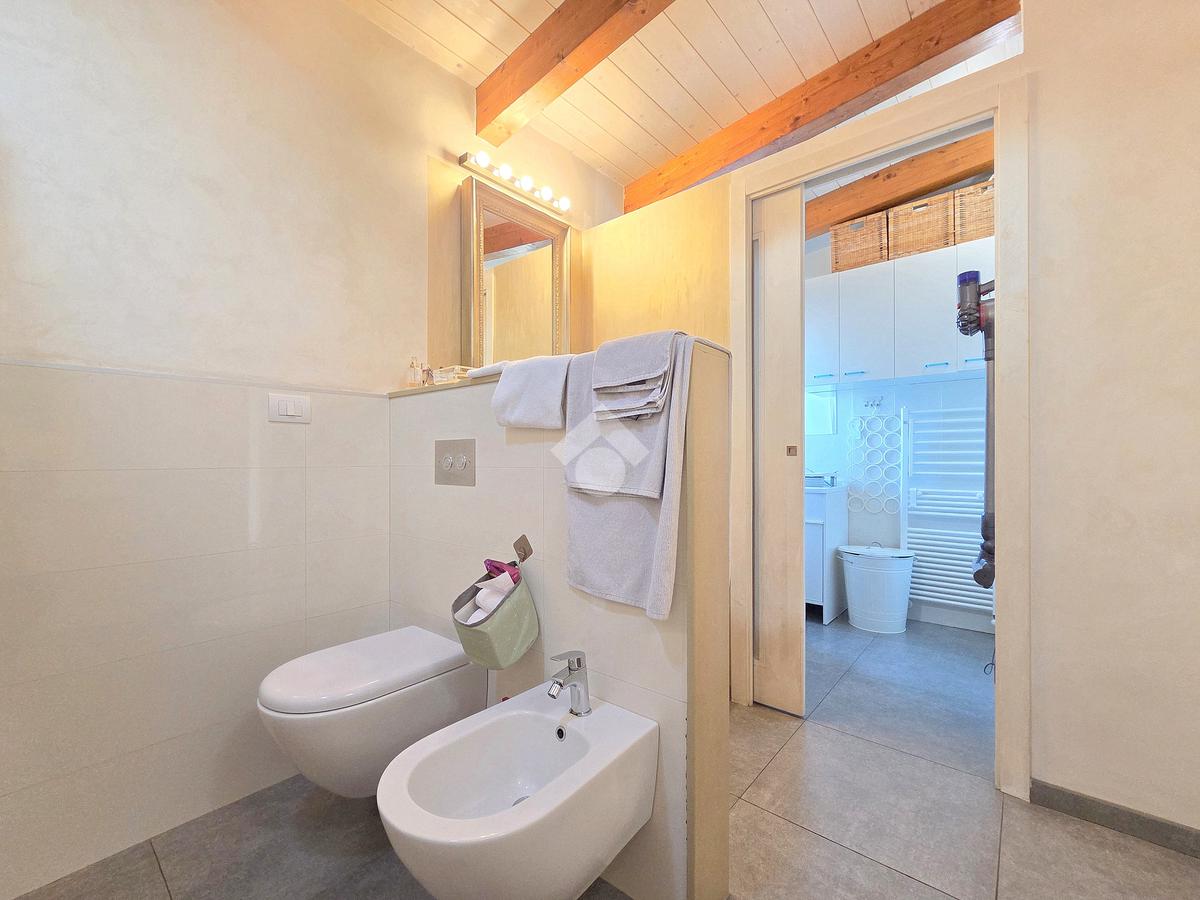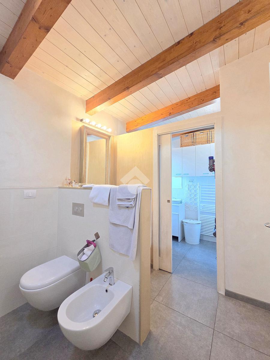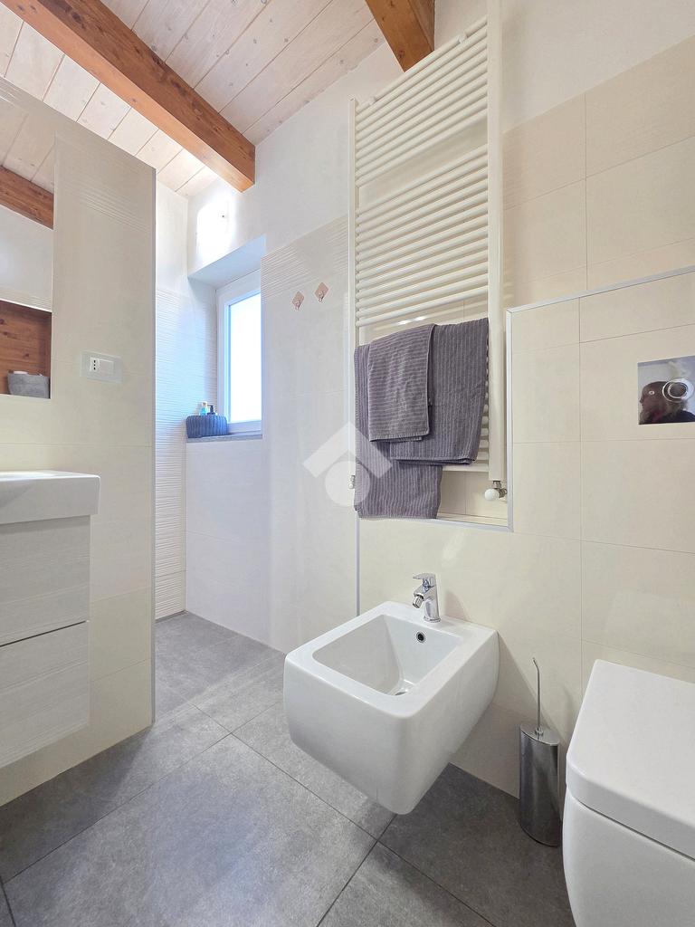 La zona giorno è particolarmente luminosa grazie ai cinque punti luce che ospita al suo interno, tra finestre, porte e finestre e Velux. Valorizzata dalle sue dimensioni che si avvicinano ai 50 metri, quest'ultima consente di percepire la completa e attenta ristrutturazione che ha toccato ogni dettaglio dell'appartamento. Progettata con l'isola centrale che accoglie piano cottura e lavandino, la zona giorno accede al terrazzo abitabile dal quale si gode di una piacevole vista panoramica. Dal lato opposto, il soggiorno doppio, ospita la zona divani e TV con le 2 finestre che la caratterizzano. L'ingresso dalla porta blindata è preceduto dal funzionale ripostiglio sul pianerottolo, che funge da scarpiera e da appendiabiti. Accedendo all'immobile veniamo accolti dal grande disimpegno aperto sulla zona giorno, dal quale è possibile raggiungere la prima delle 3 camere. Finestrata e molto alta nelle sue pareti, quest'ultima è attualmente utilizzata come studio. Attraverso la porta a scrigno, è possibile raggiungere il disimpegno della zona notte che serve le altre 2 camere da letto. La prima, specificatamente ampia, è stata progettata per ospitare la lunga cabina armadi a vista. La seconda, oltre ad accedere allo stesso terrazzo della zona giorno, possiede il bagno privato. Accessibile dalla porta a scomparsa, quest'ultimo è finestrato ed è stato rifinito in modo straordinario. Lavandino e sanitari sospesi sono nel primo ambiente, mentre la doccia walk-in è disimpegnata da un muro di fronte alla finestra. Dallo stesso disimpegno della zona notte, si accede al secondo bagno caratterizzato dalle sue dimensioni. Il lavandino in muratura rifinito in mosaico rosso, confina con il muro che ospita i sanitari sospesi. Di fronte ad essi è presente la doppia doccia in cristallo Walk-in con piatto a filo pavimento, rifinito con lo stesso mosaico del lavandino. Al suo interno, il secondo bagno, ospita anche la comoda lavanderia accessibile da una porta scorrevole. Internamente, oltre al lavello a mano, trovano spazio anche lavatrice ed asciugatrice. Al piano terreno la proprietà comprende anche 2 posti auto scoperti e 2 coperti. Finestrato su tutti e quattro i lati, l'appartamento è posizionato al primo piano rialzato di una villa bifamiliare e possiede il tetto in legno bianco, completamente a vista. Priva di spese condominiali, la villa offre molti spazi comuni ed è ubicata in una posizione ricca di privacy. È possibile acquistare un terreno attiguo alla villa, collegato direttamente alla proprietà ad € 10.000. Il riscaldamento è autonomo a gpl e, i bassi consumi sono stati resi possibili grazie all'attenta coibentazione di tetto e muri perimetrali.